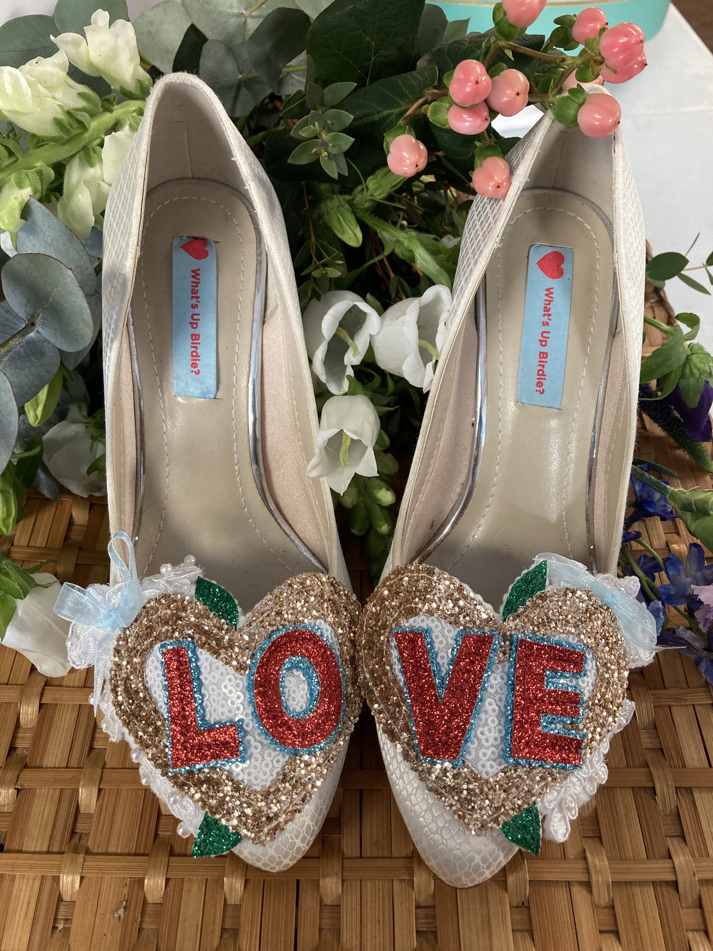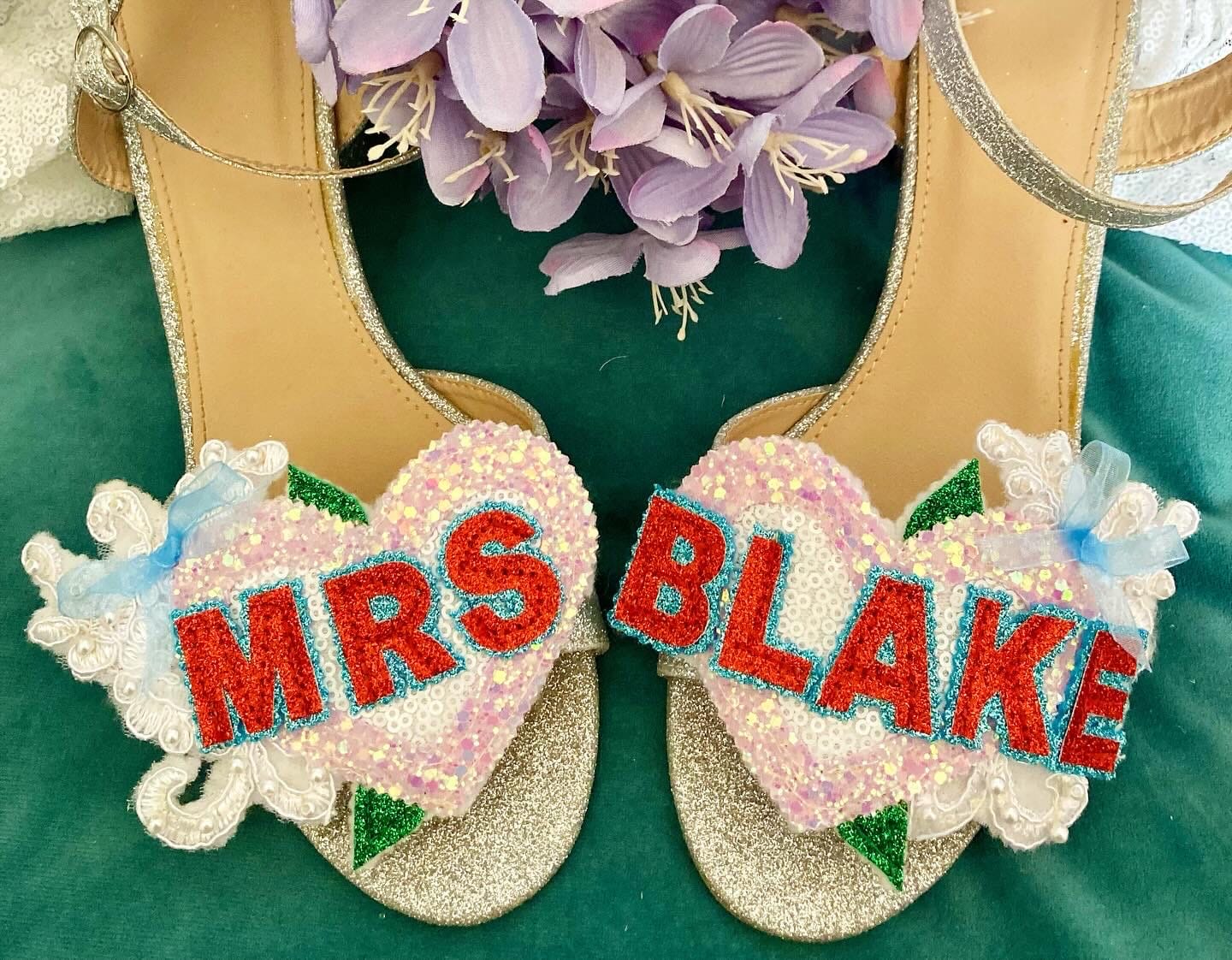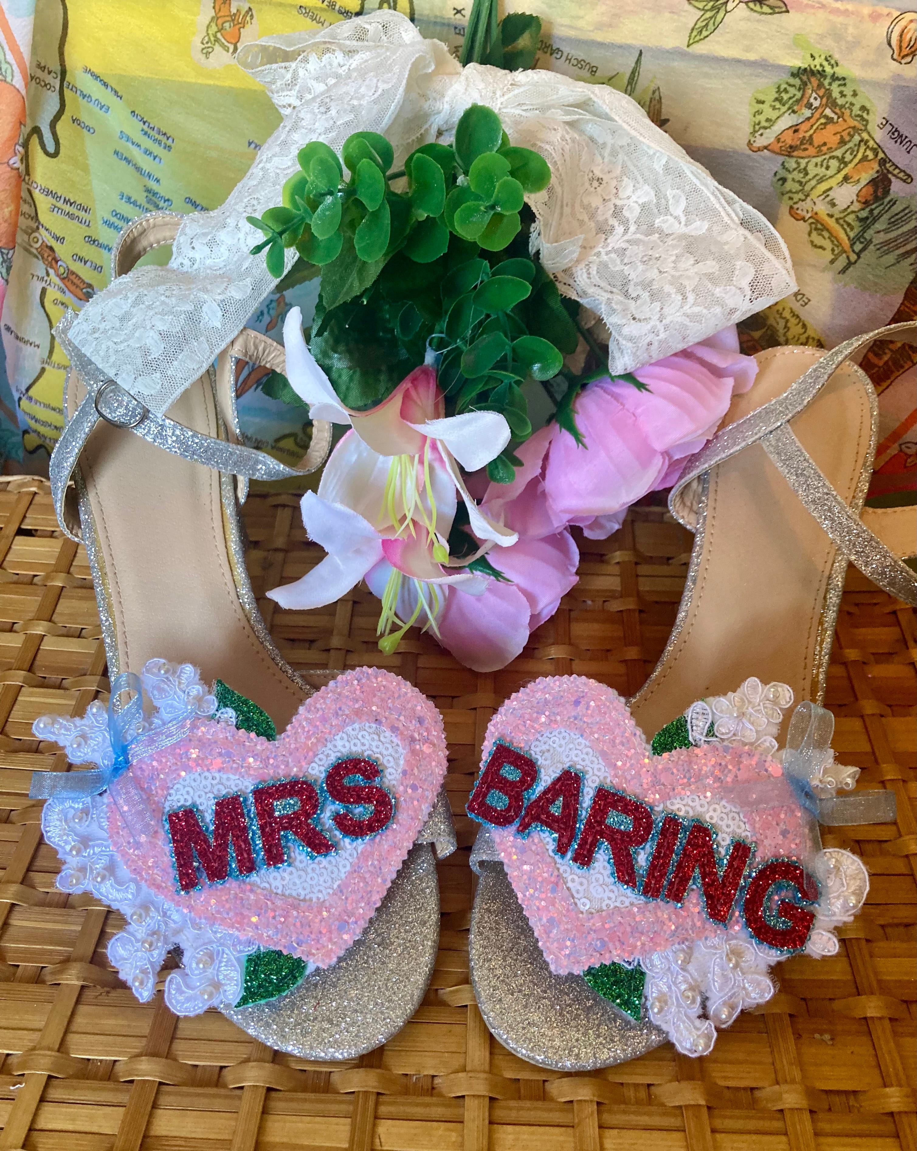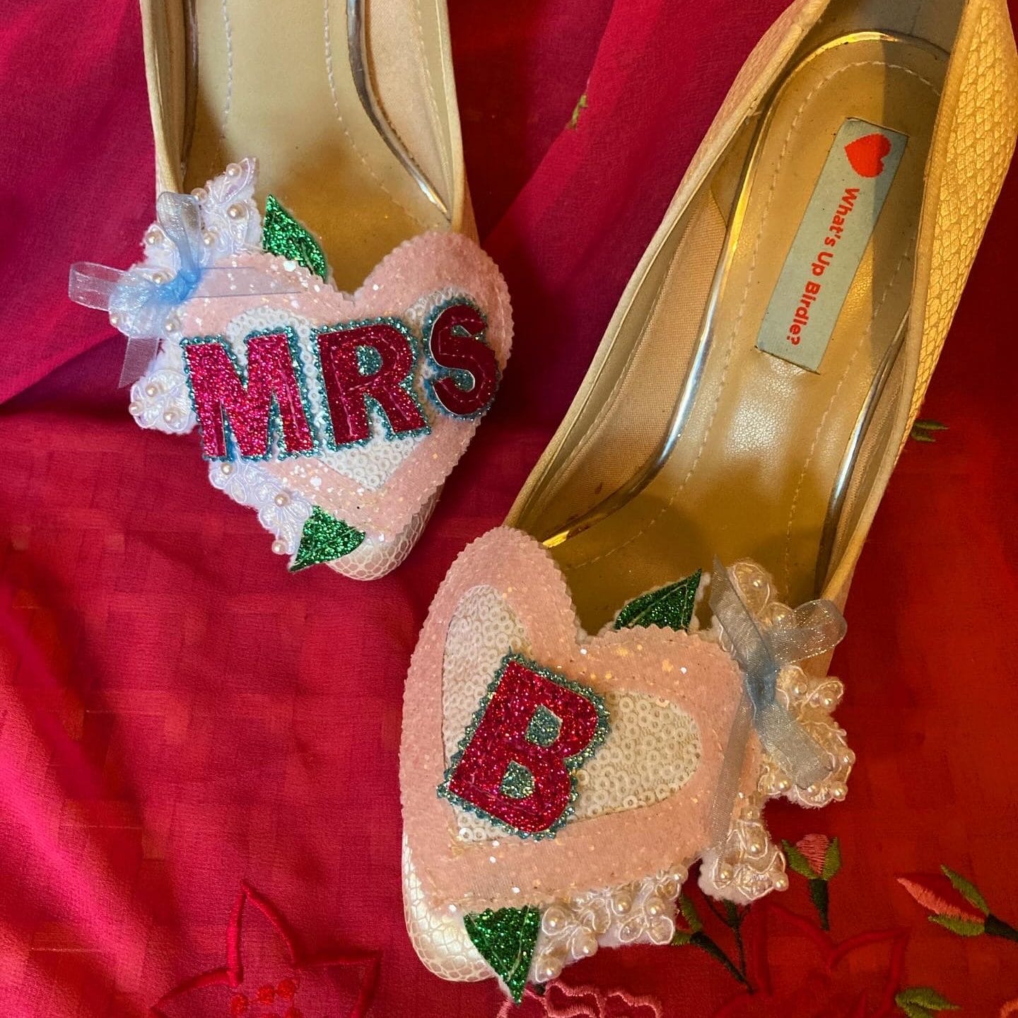 Beautiful handmade bespoke personalised detachable shoe clips. Choose from LOVE, AMORE, MR MRS, Til Death, MRS NAME, True Love, I DO or your choice up to 6 letters per foot wedding shoe clips.