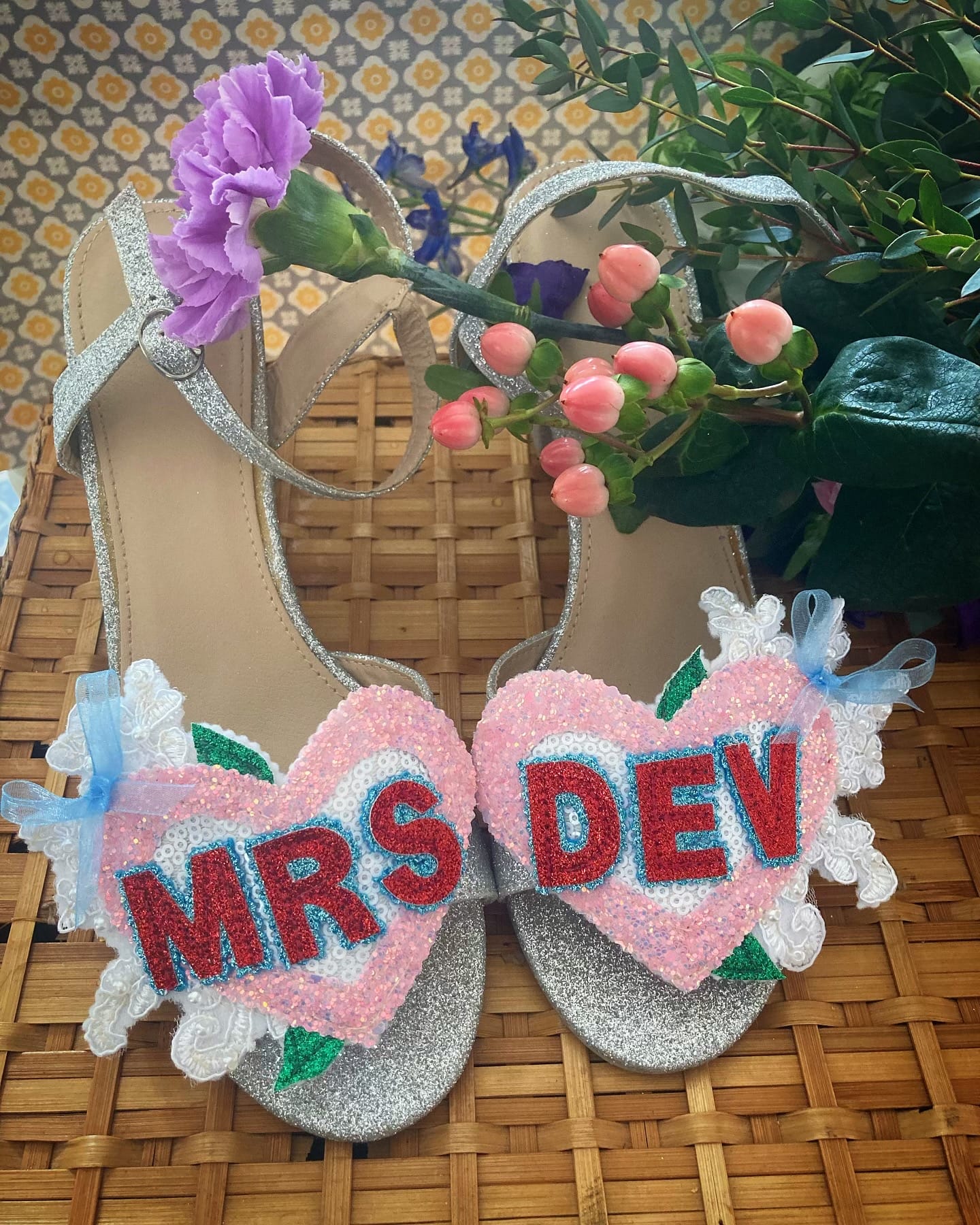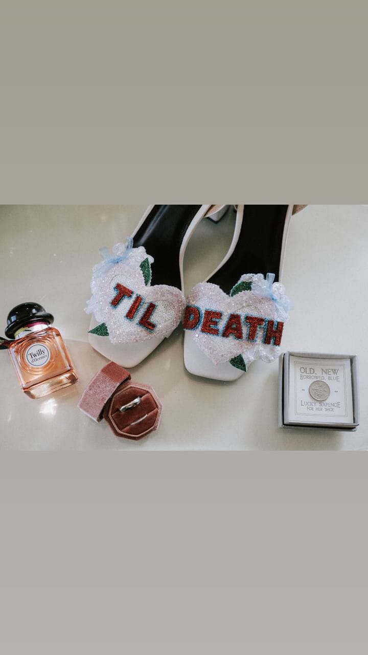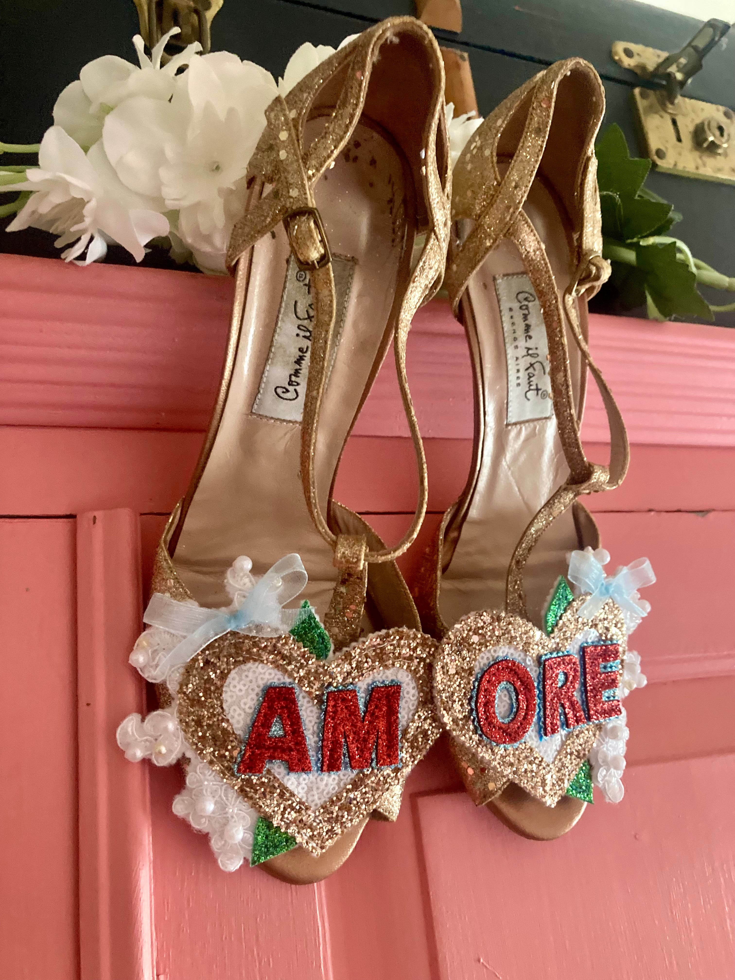 Beautiful handmade bespoke personalised detachable shoe clips. Choose from LOVE, AMORE, MR MRS, Til Death, MRS NAME, True Love, I DO or your choice up to 6 letters per foot wedding shoe clips.