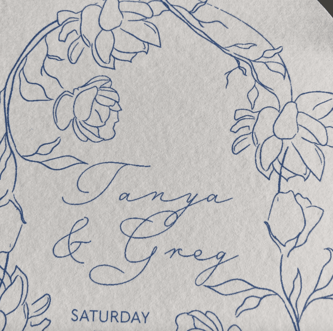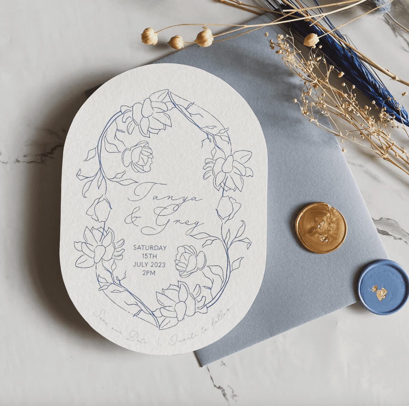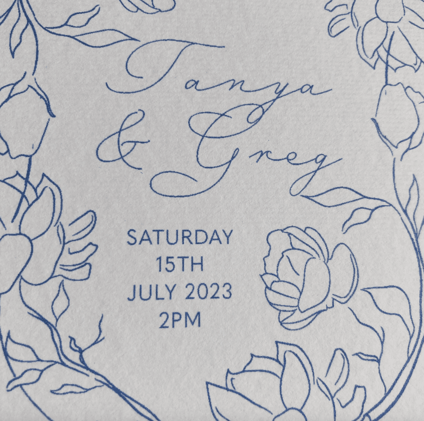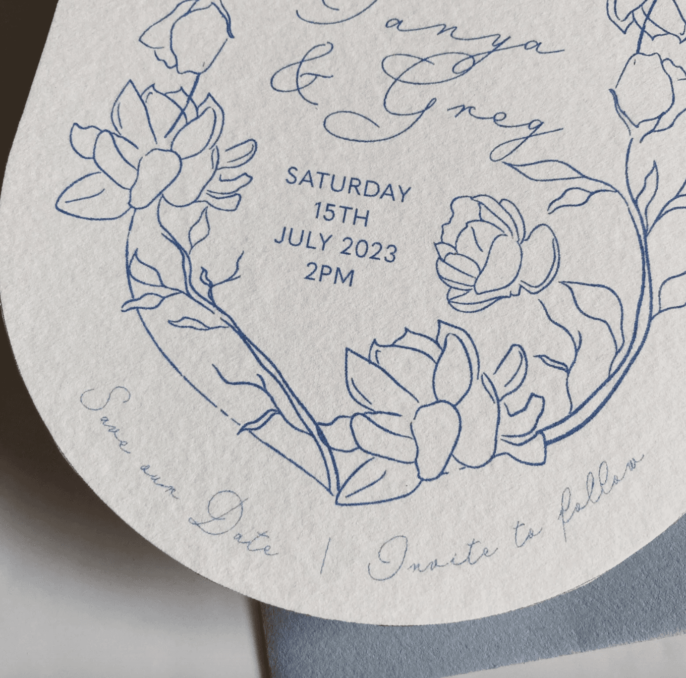 Our save the dates come in size A6. The pretty floral design is printed in blue ink, onto luxury white card, which has a slight lined texture to it. All our save the dates come with a luxury dusty blue envelope.