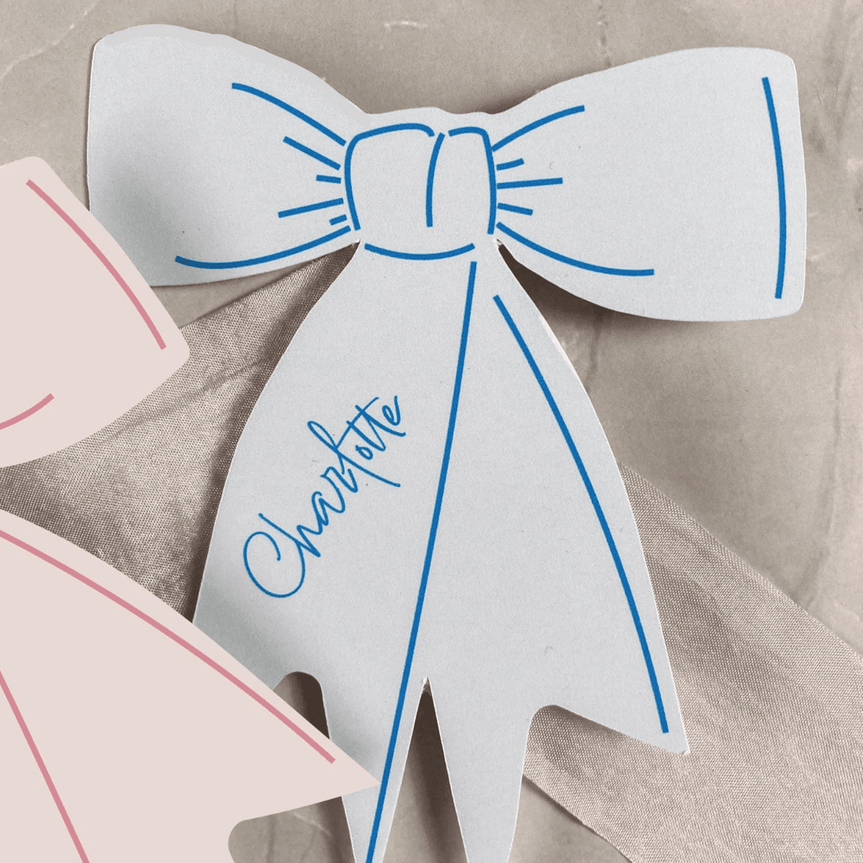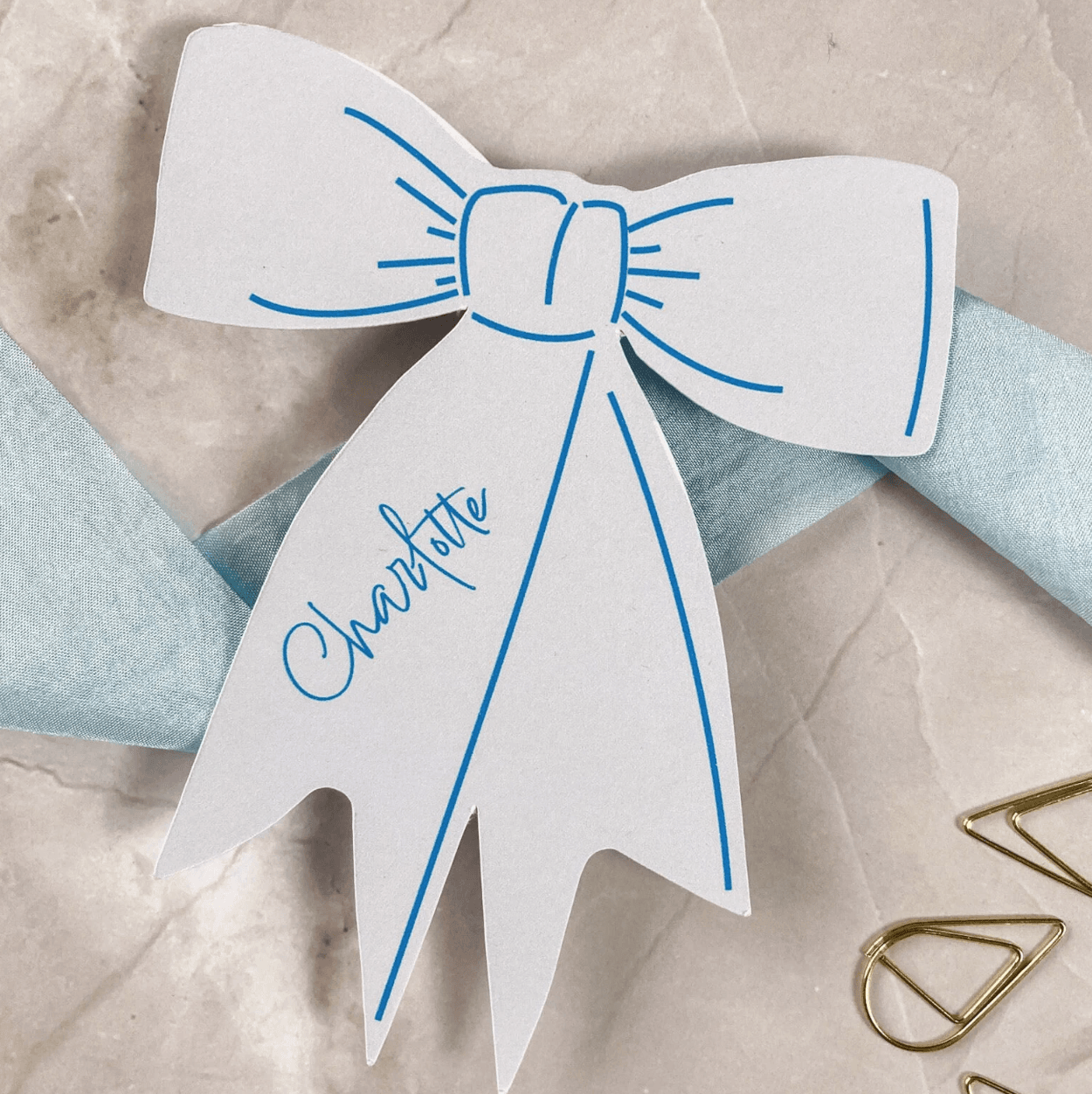 Each bow place name is printed in a beautiful blue colour, onto white card. Pastel colours are perfect for a spring, summer or destination wedding or event.