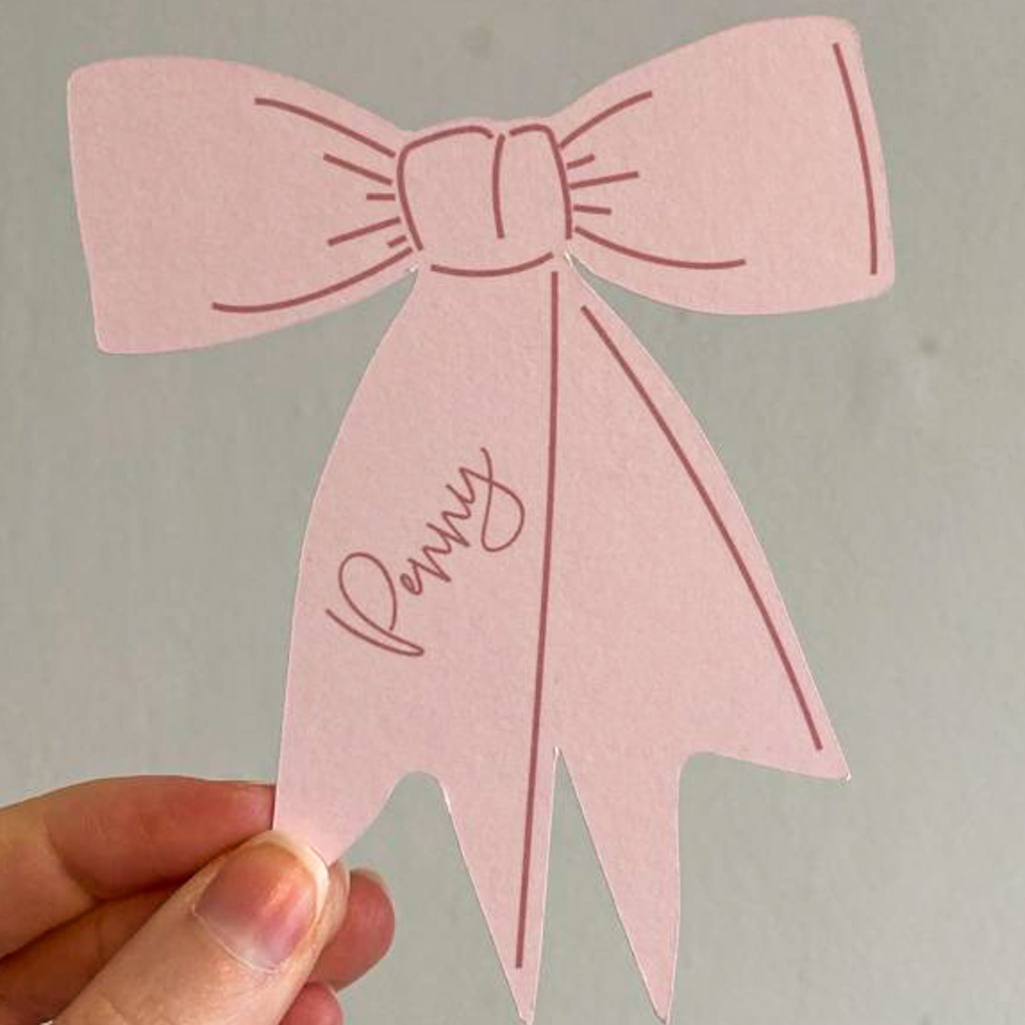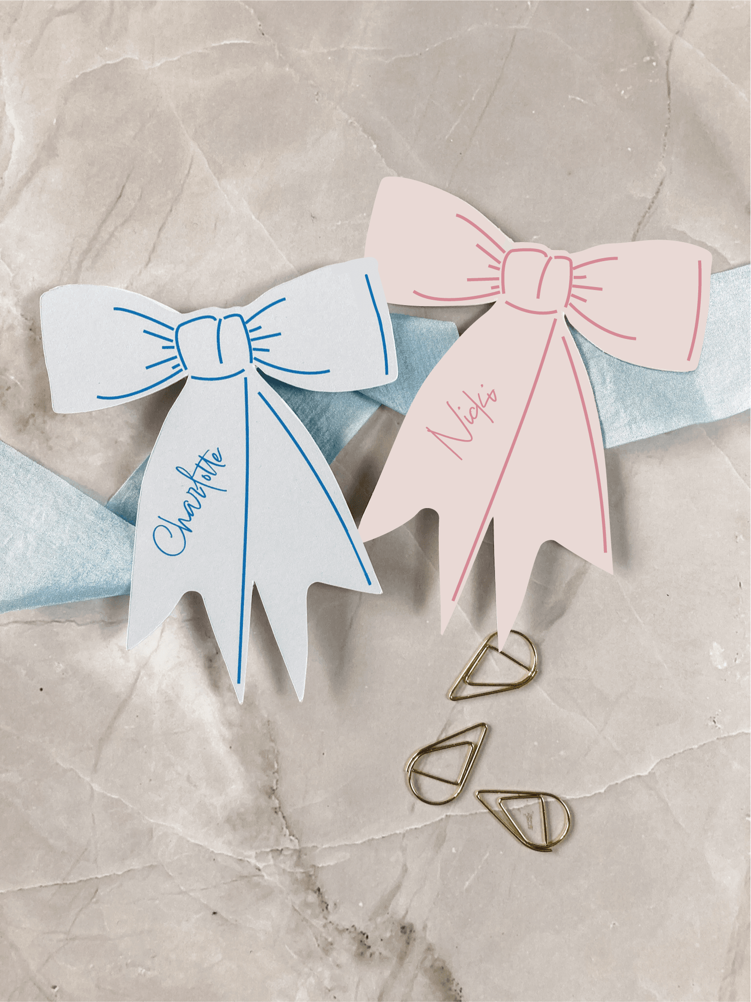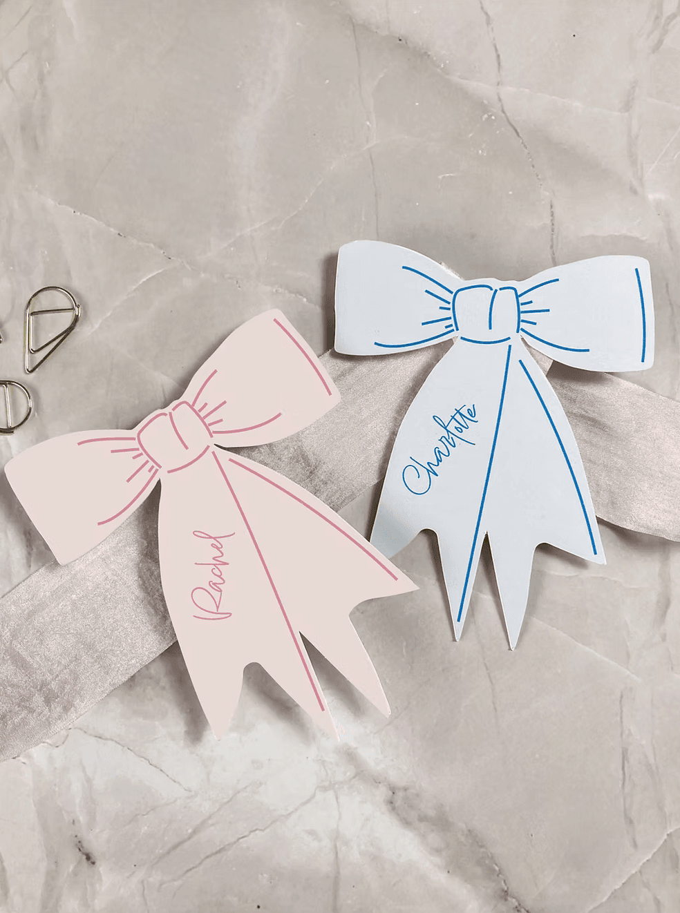 Each bow place name is printed in a beautiful light pink, onto white card. Pastel colours are perfect for a spring or summer wedding or event.