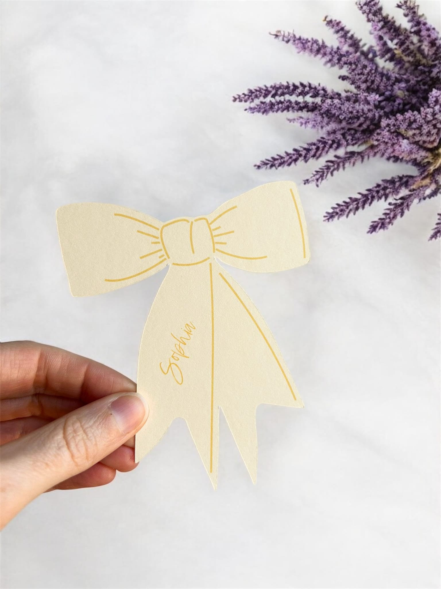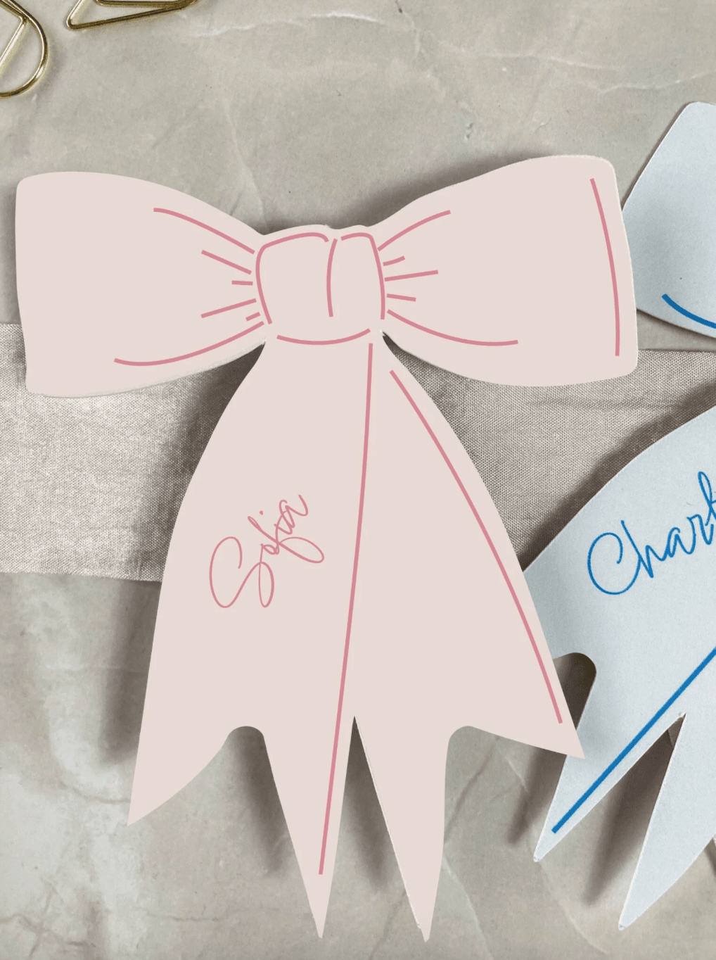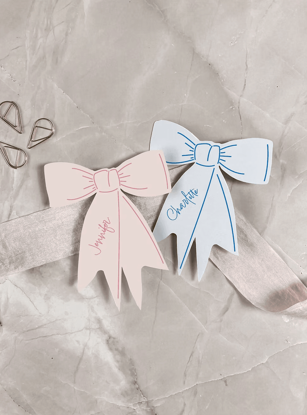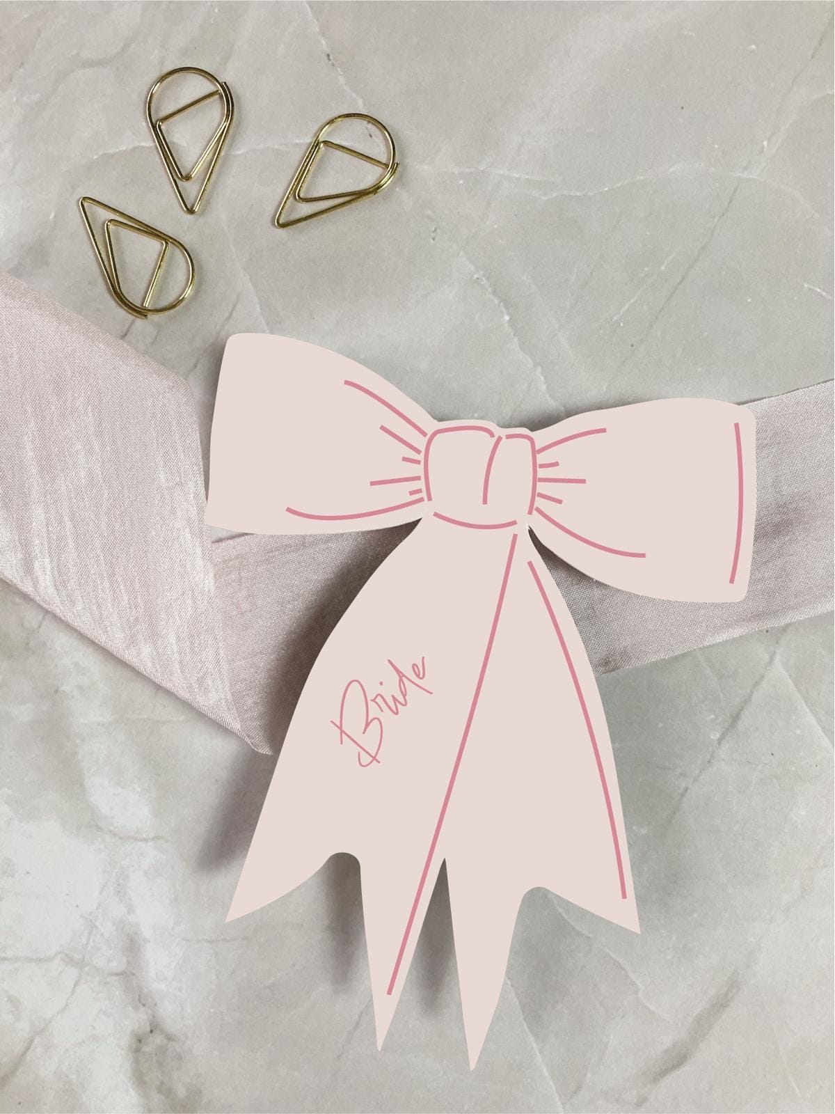 Each bow place name is printed in a beautiful light pink, onto white card. Pastel colours are perfect for a spring or summer wedding or event.