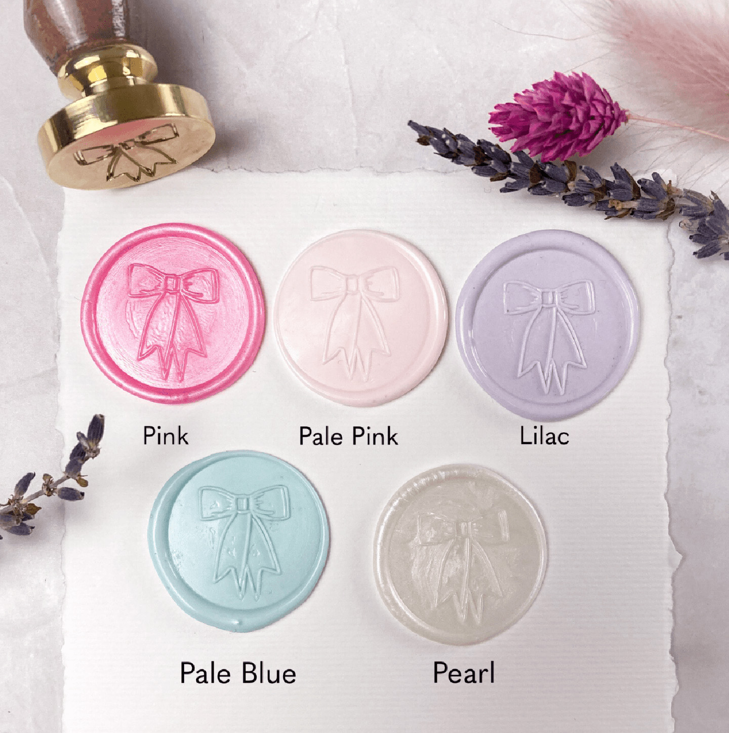 Our bow wax seals come with a self adhesive sticker on the back. Great for use on place names, envelopes, invitations, wrapping paper and more. Available in 18 different colours including pale pink, pale blue, black and white which match our bow place names perfectly. And now we have an on trend lilac colour too!