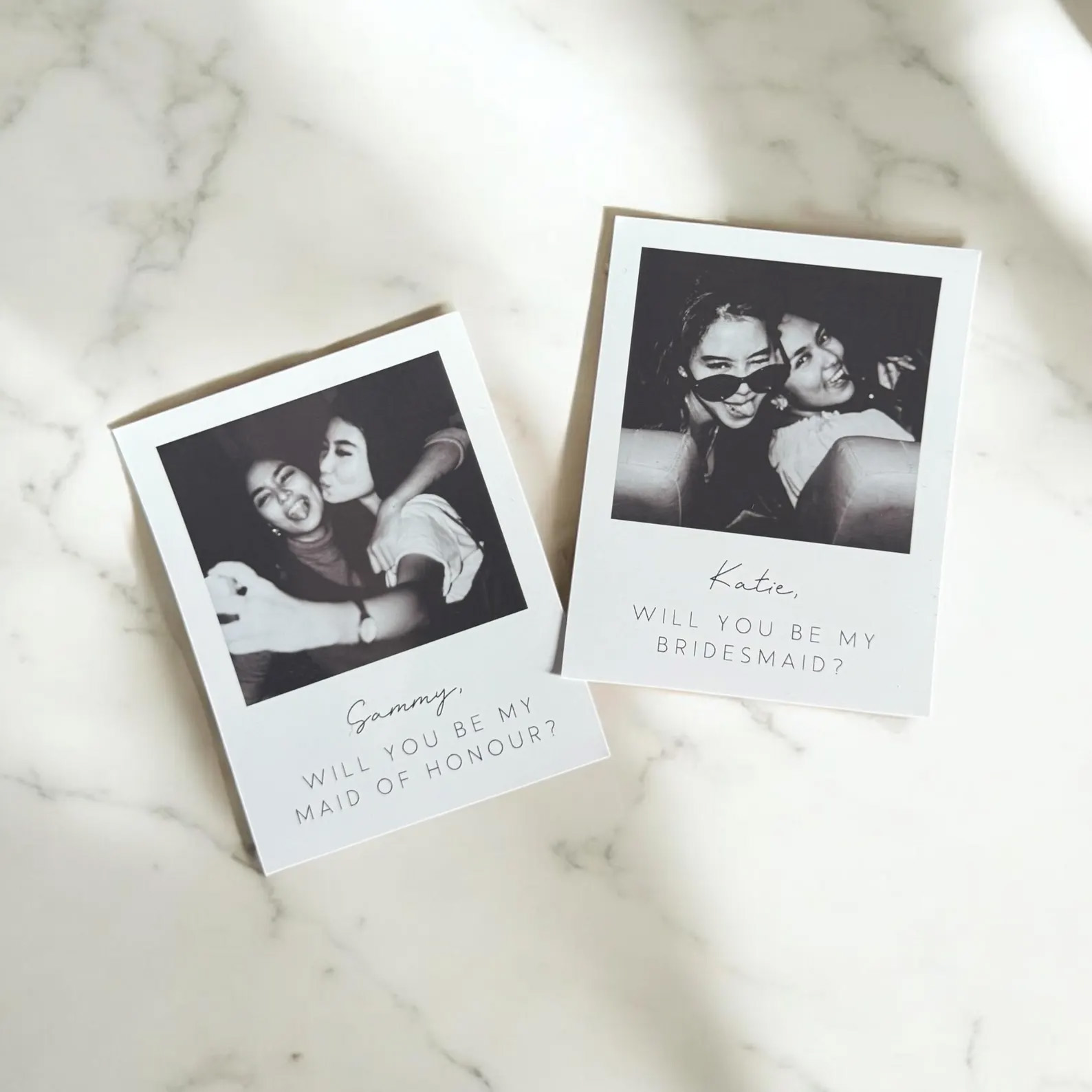Pop the big question to your best girls in the most memorable way with our Polaroid-style Bridesmaid Proposal Cards! ?? Printed on high-quality glossy photo card, these elegant keepsakes feature a photo of your choice in either colour or black & white, giving you the perfect way to make your proposal personal and heartfelt.