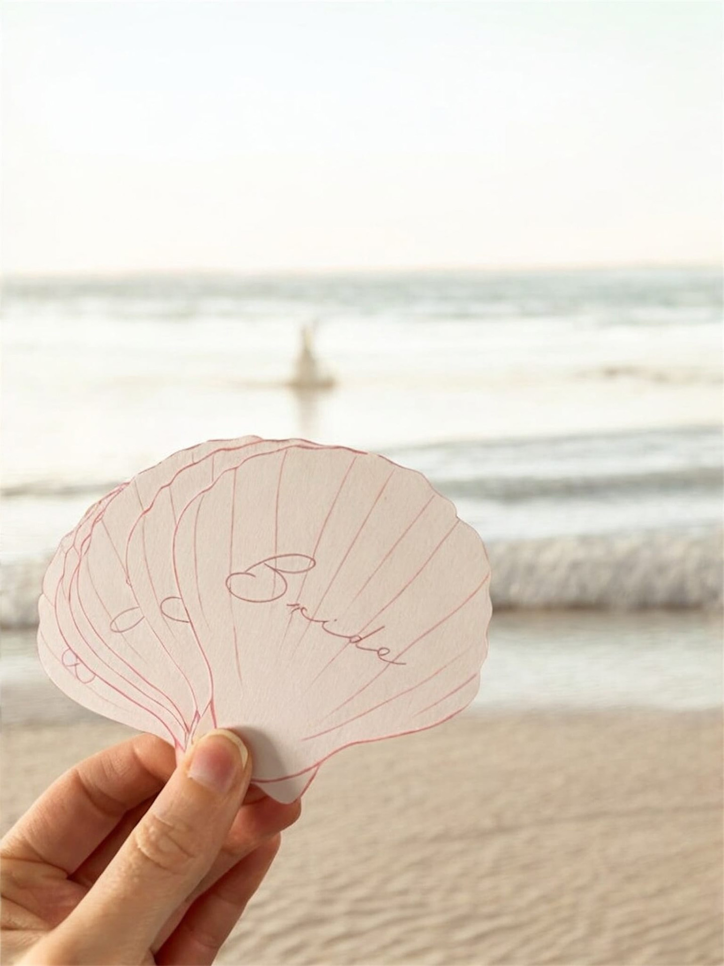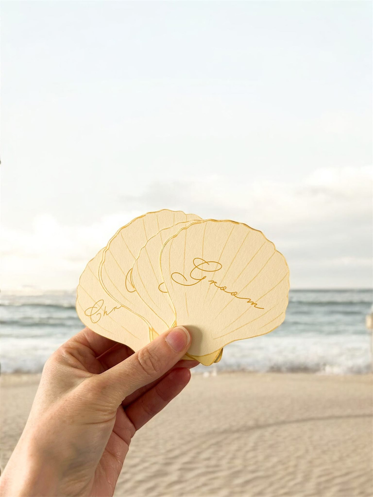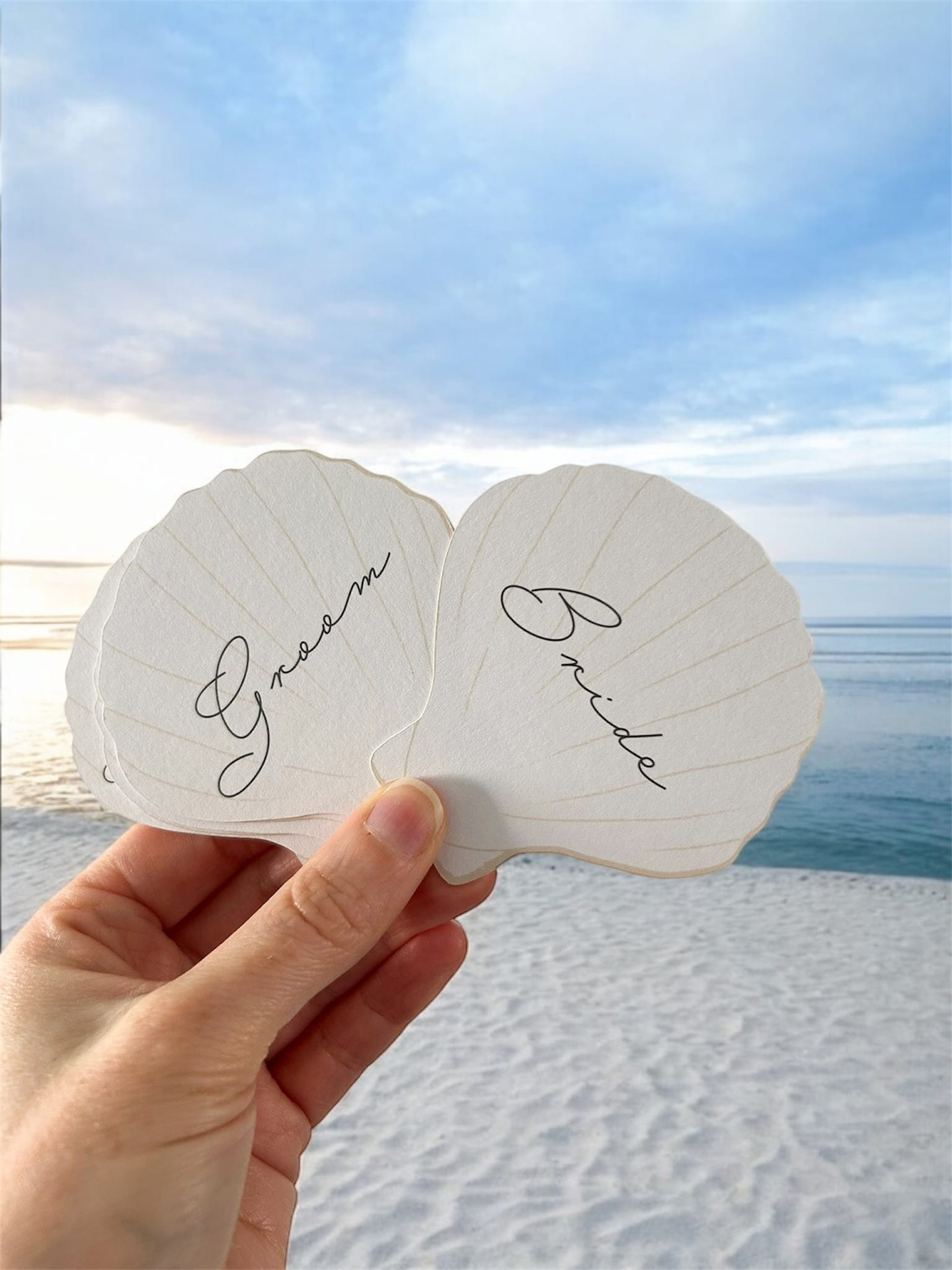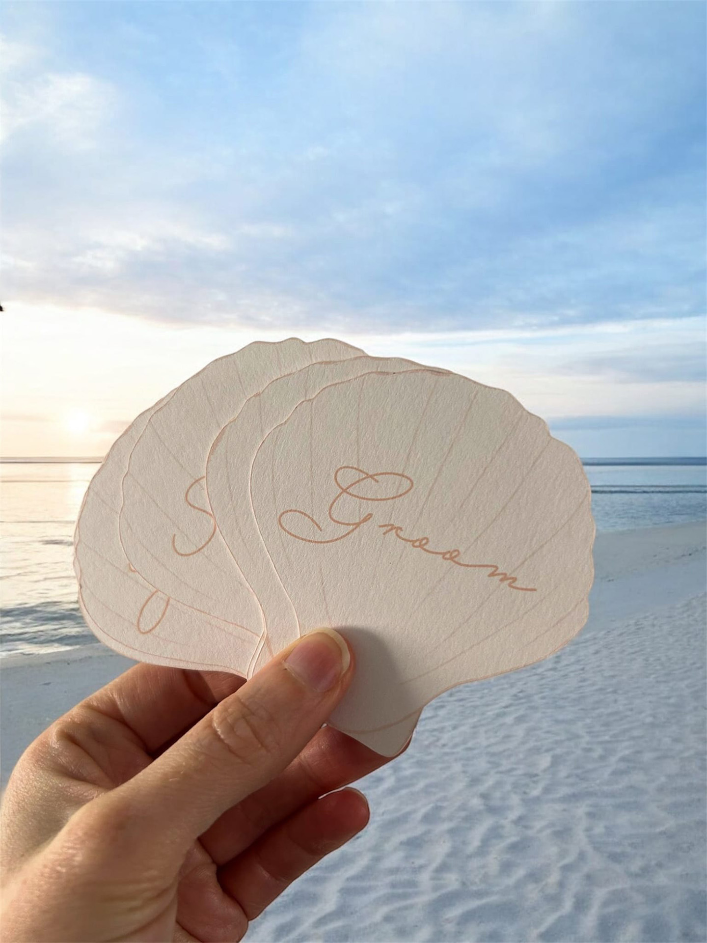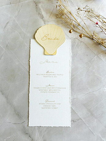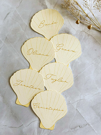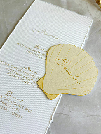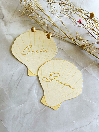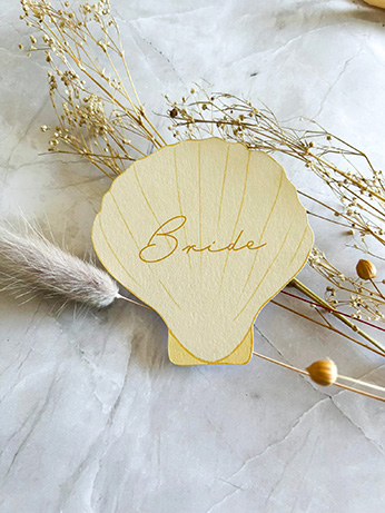 Each place name is printed in THE colour of the season – a butter yellow shell design, onto white card and cut into a shell shape, perfect for a destination wedding or event. These place names pair nicely with our DL size menu (as pictured).