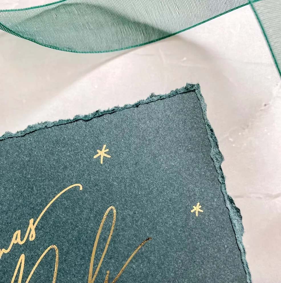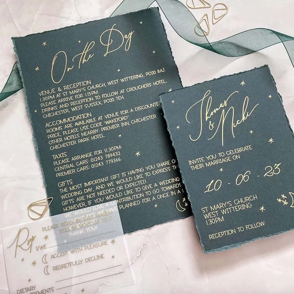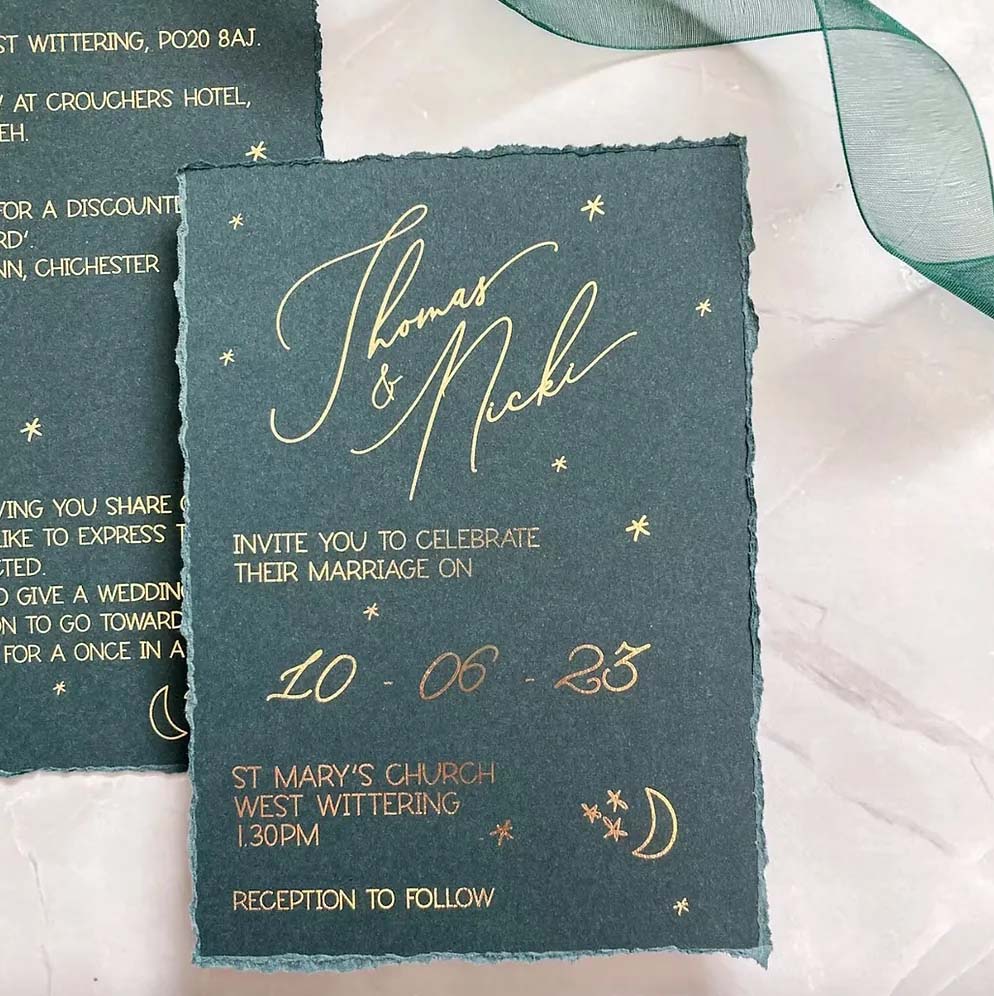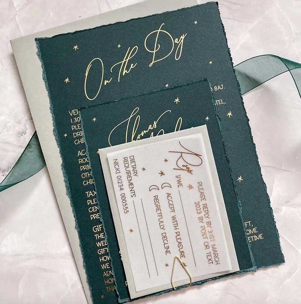 - MAIN INVITE PAGE – digital gold foil on A6 dark green card finished with a deckled edge.