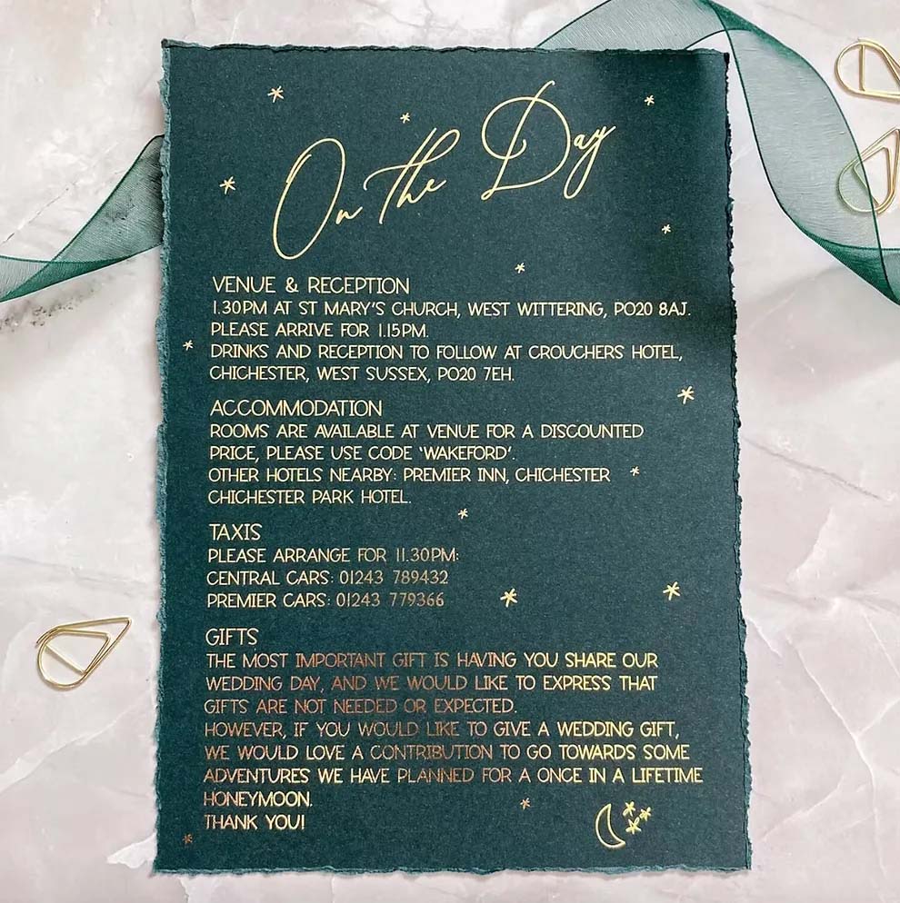 - DETAILS/ON THE DAY PAGE – digital gold foil on A5 dark green card finished with deckled edge.