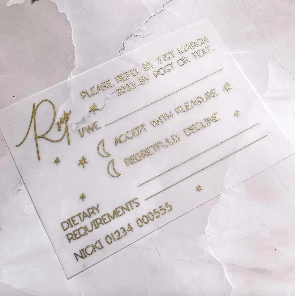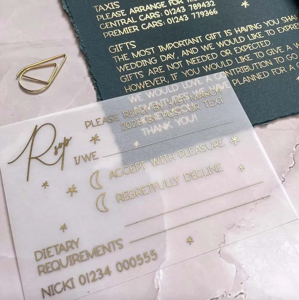 - This invite is finished off with a gold tear drop paperclip as standard, to hold your invite together as seen in the images. If you’re looking for something else such as ribbon or vellum jackets etc, just get in touch before you place your order.