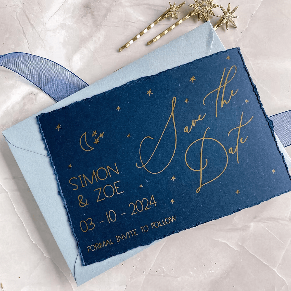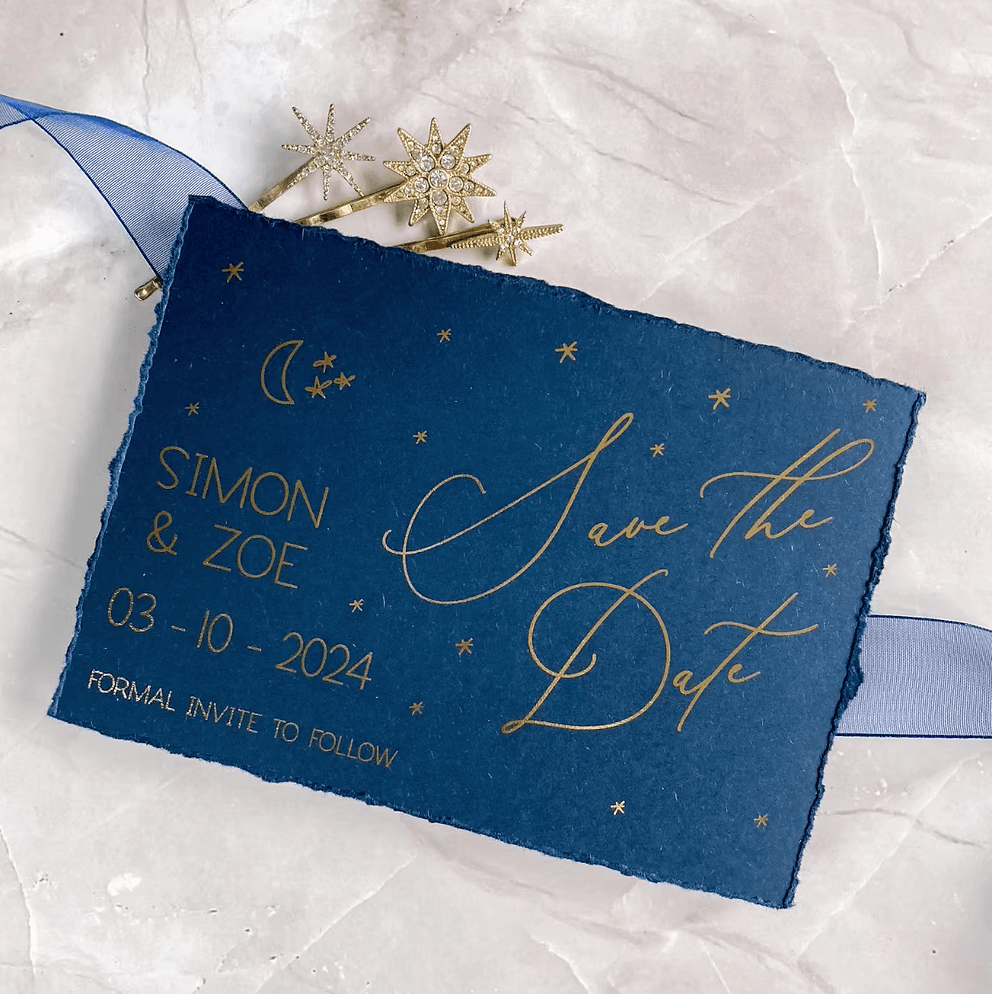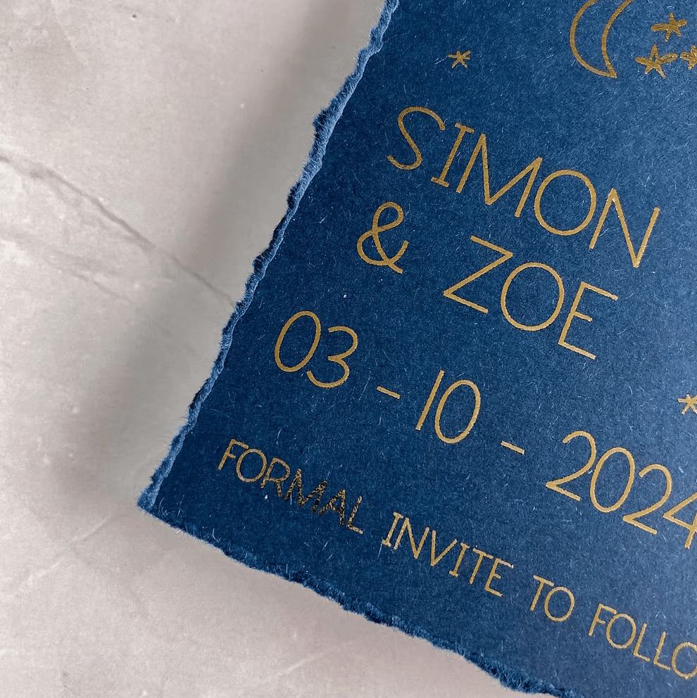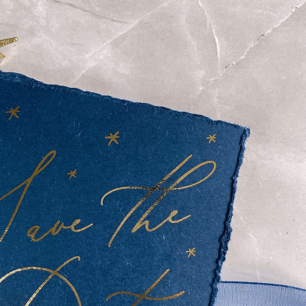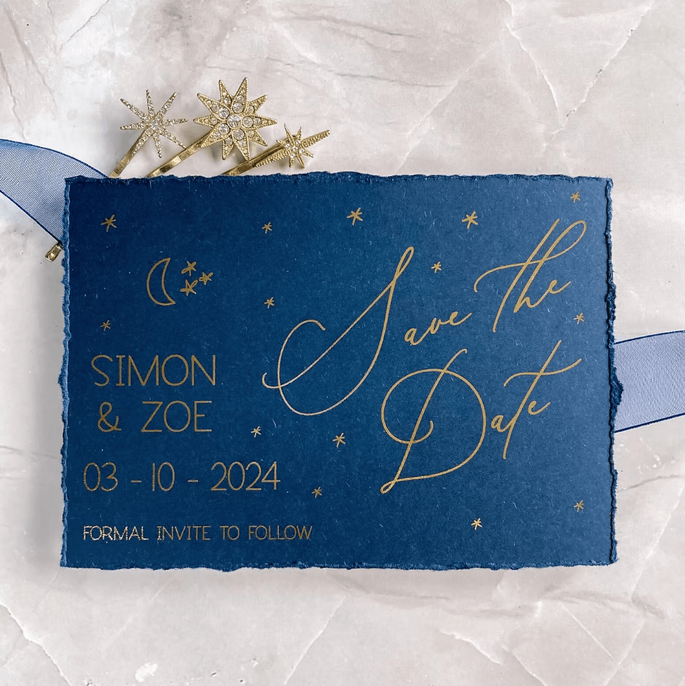 - SAVE THE DATE – Digital gold foil on A6 navy card finished with a deckled edge