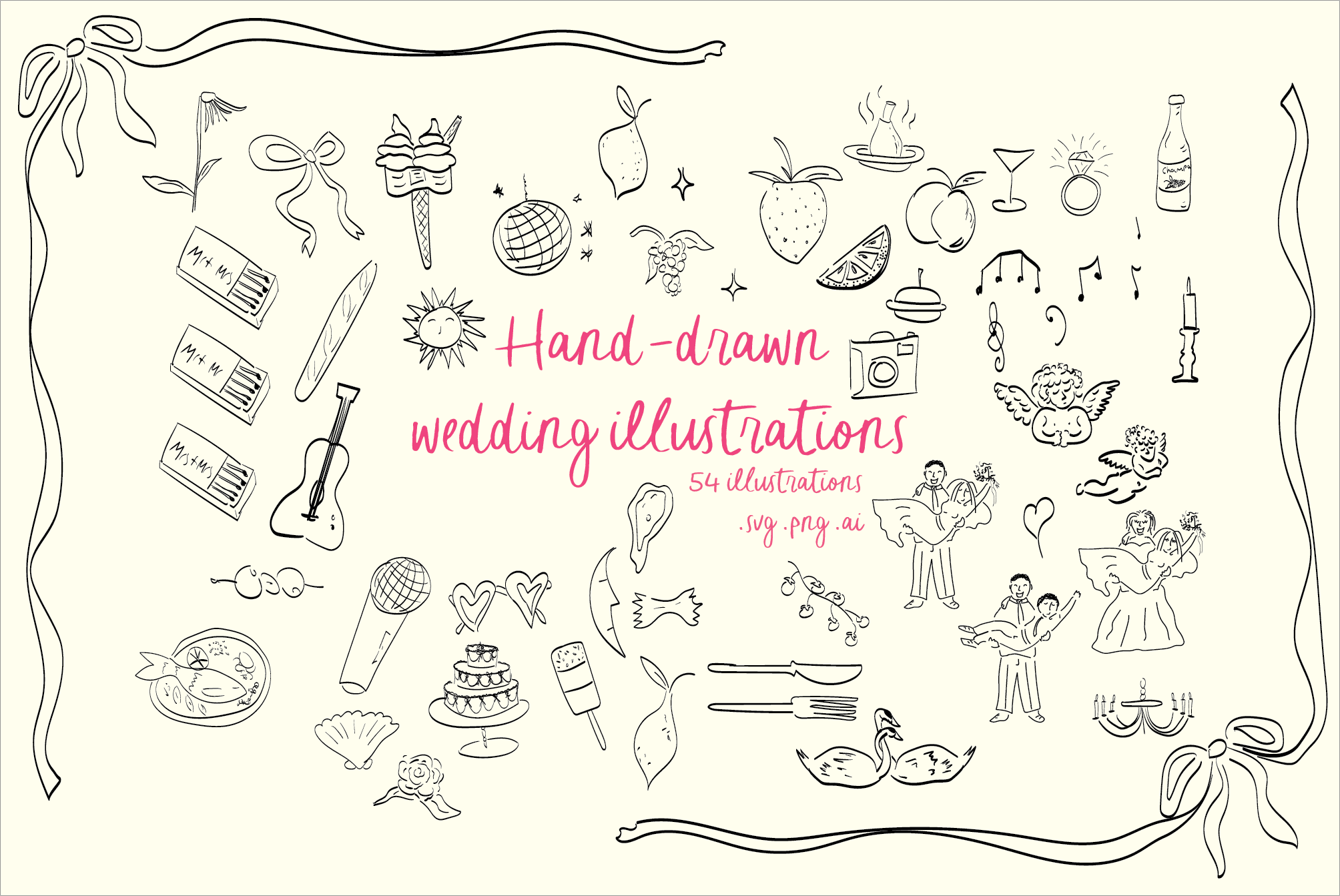 Whimsical Wedding SVG Clipart Bundle with Illustrations, Icons, Doodles for Wedding Invitations, Menu, Bridal Invites or Bows. Our illustrations are LGBQT+ inclusive. You will receive 54 illustrations in SVG, PNG and Adobe Illustrator format.