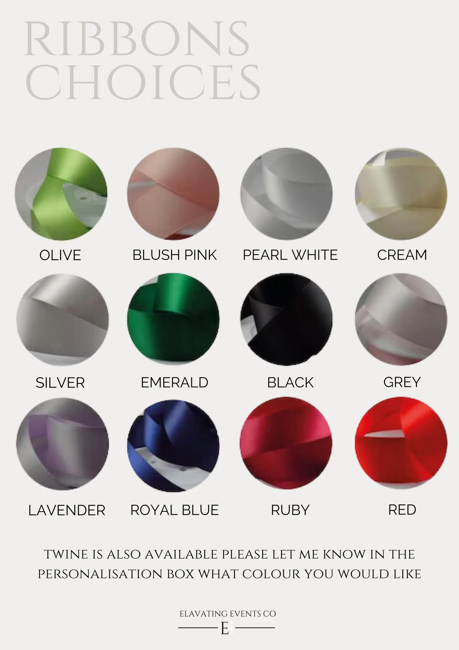Ribbon- a variety of ribbon colours are available just pop in the personalisation box which one you would like – if you don’t want ribbon please let us know in the personalisation box.