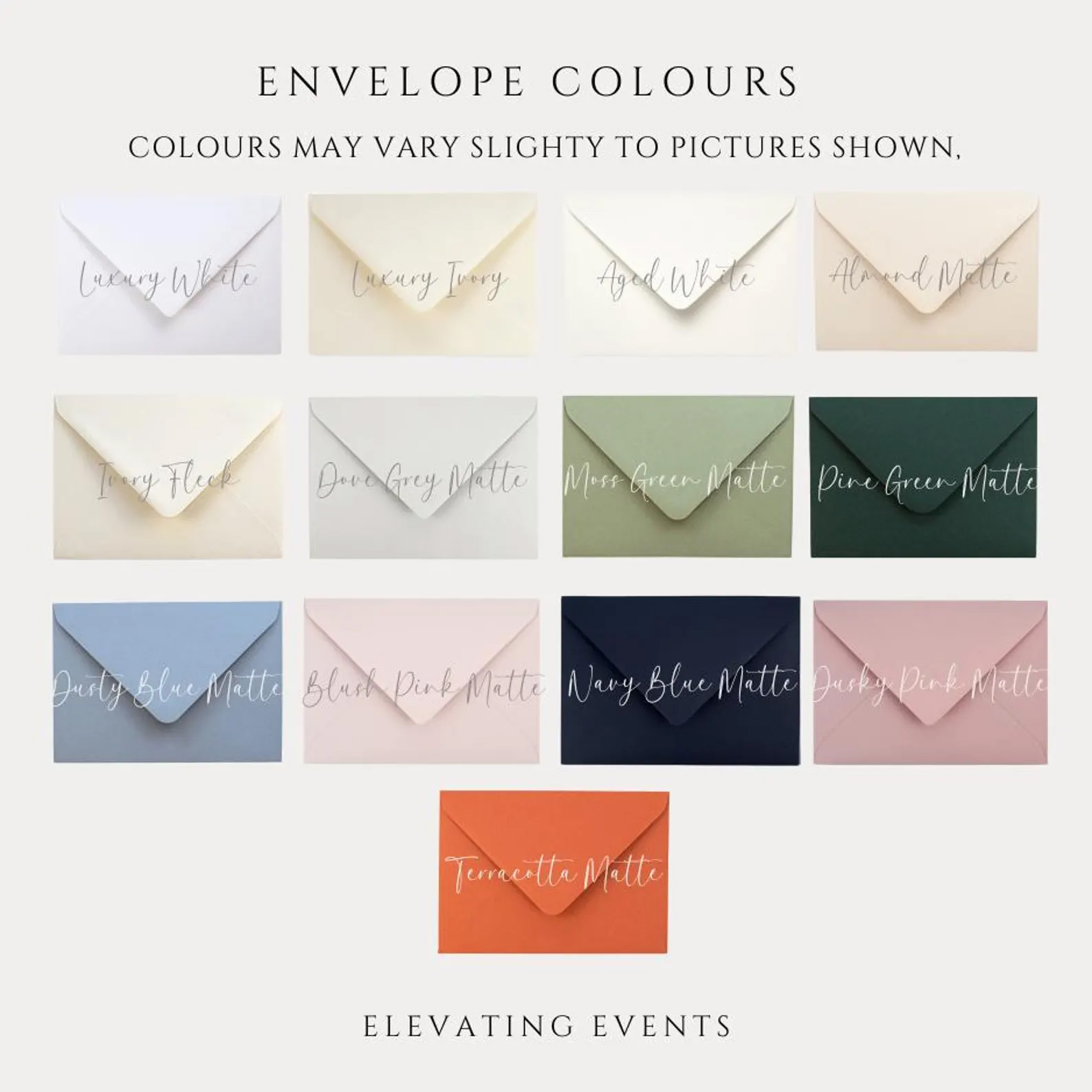 You can have you invites with or without envelopes – please note the ribbon may not match perfectly to the envelope colour