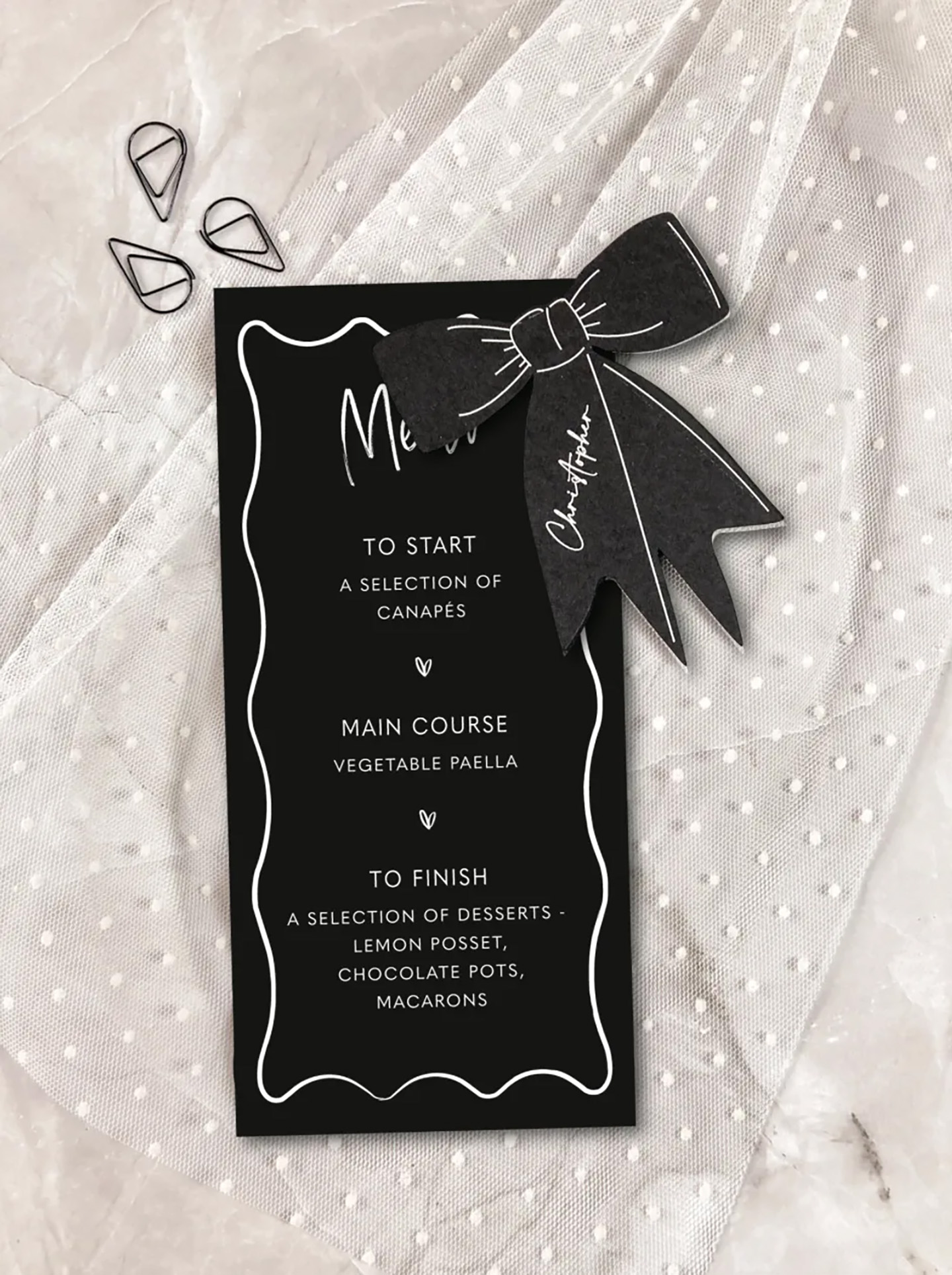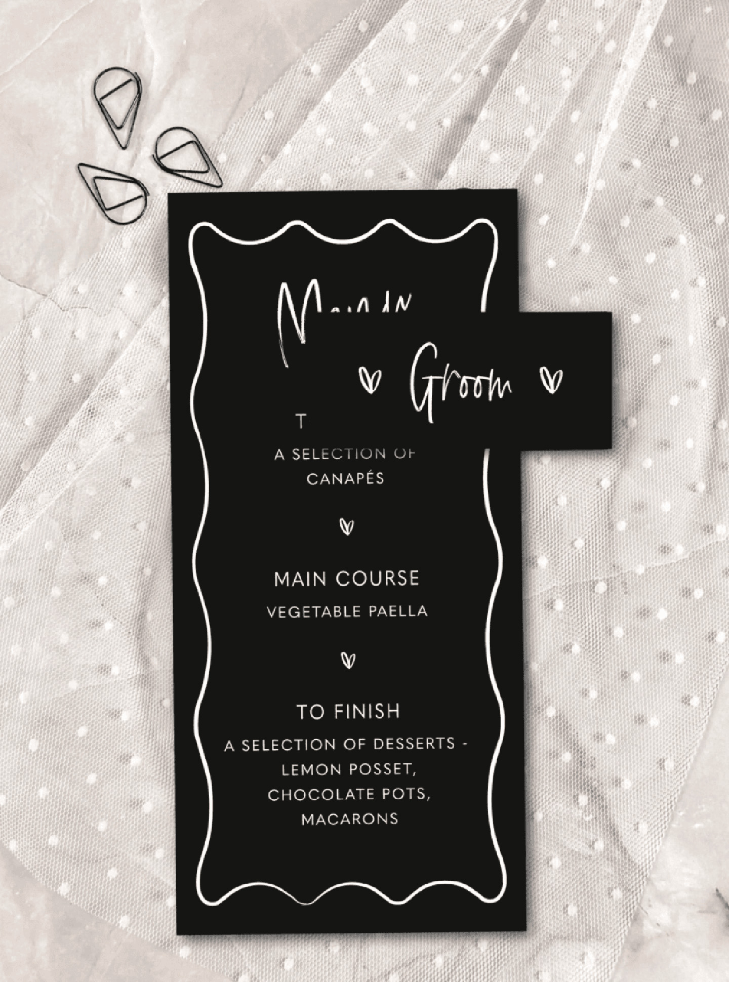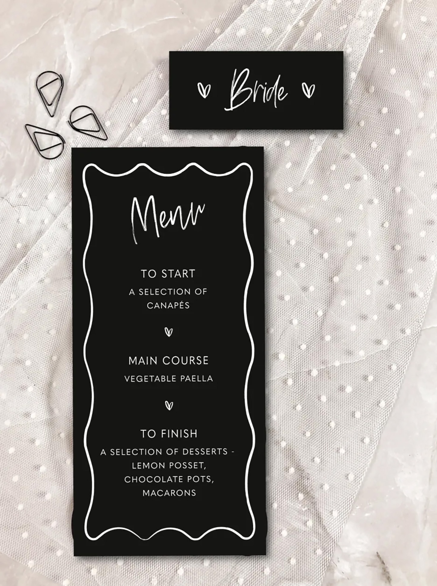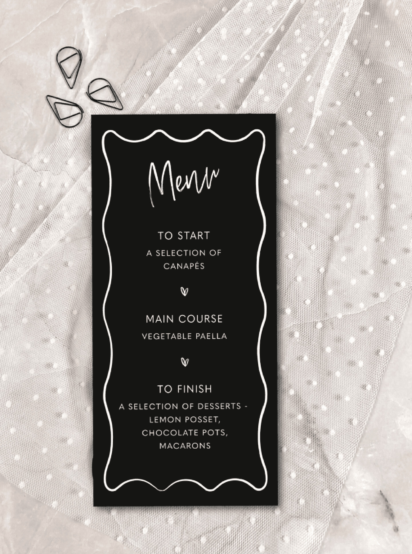 Each menu can be personalised with your own wording and is created using digital white ink printed onto black card. They are available in size DL (99mm x 210mm).
