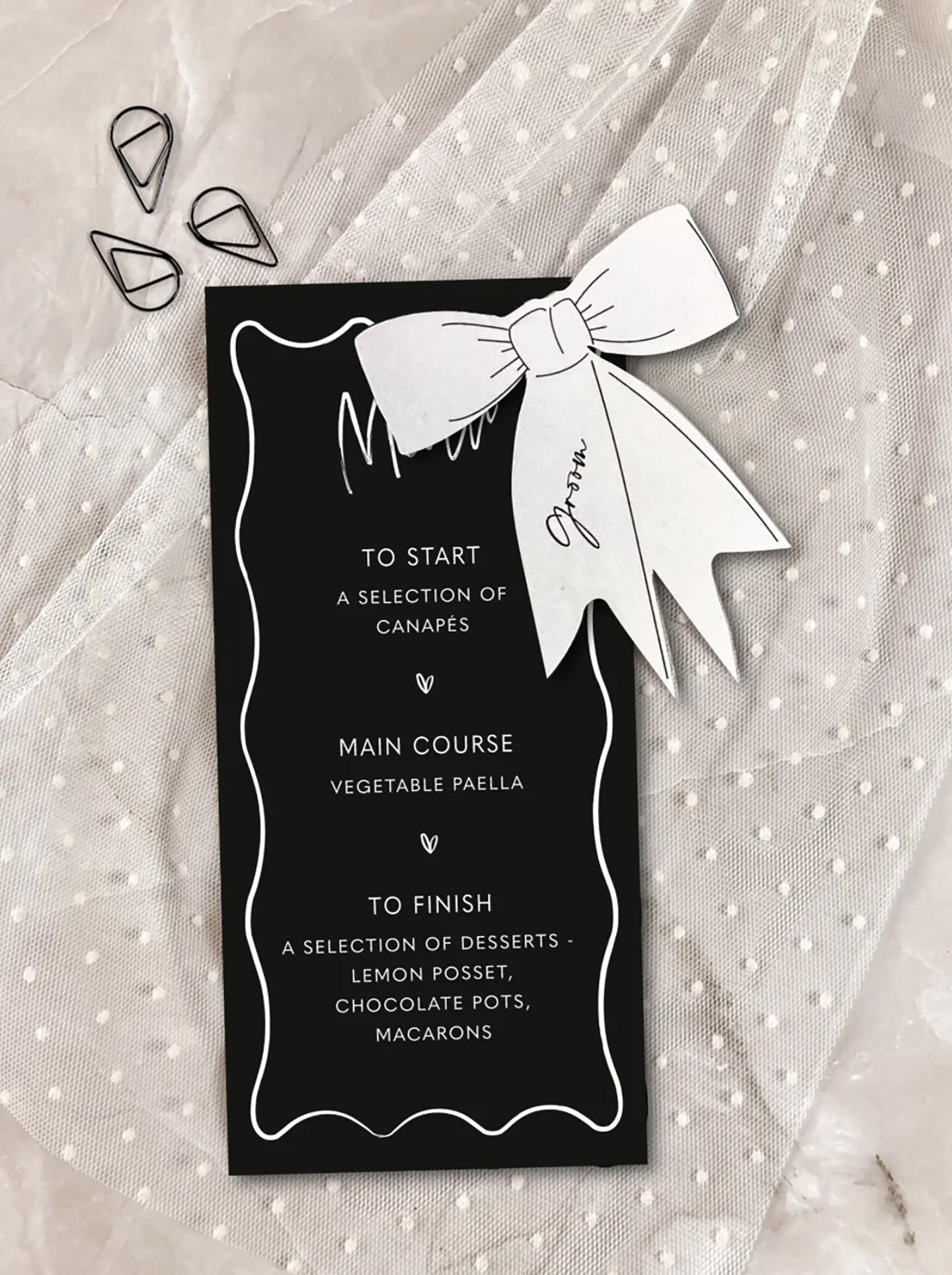 The white ink really makes the text pop against the black card. Monochrome wedding stationery is perfect for a timeless, luxurious and classic wedding, with the wave border adding a modern and unique twist