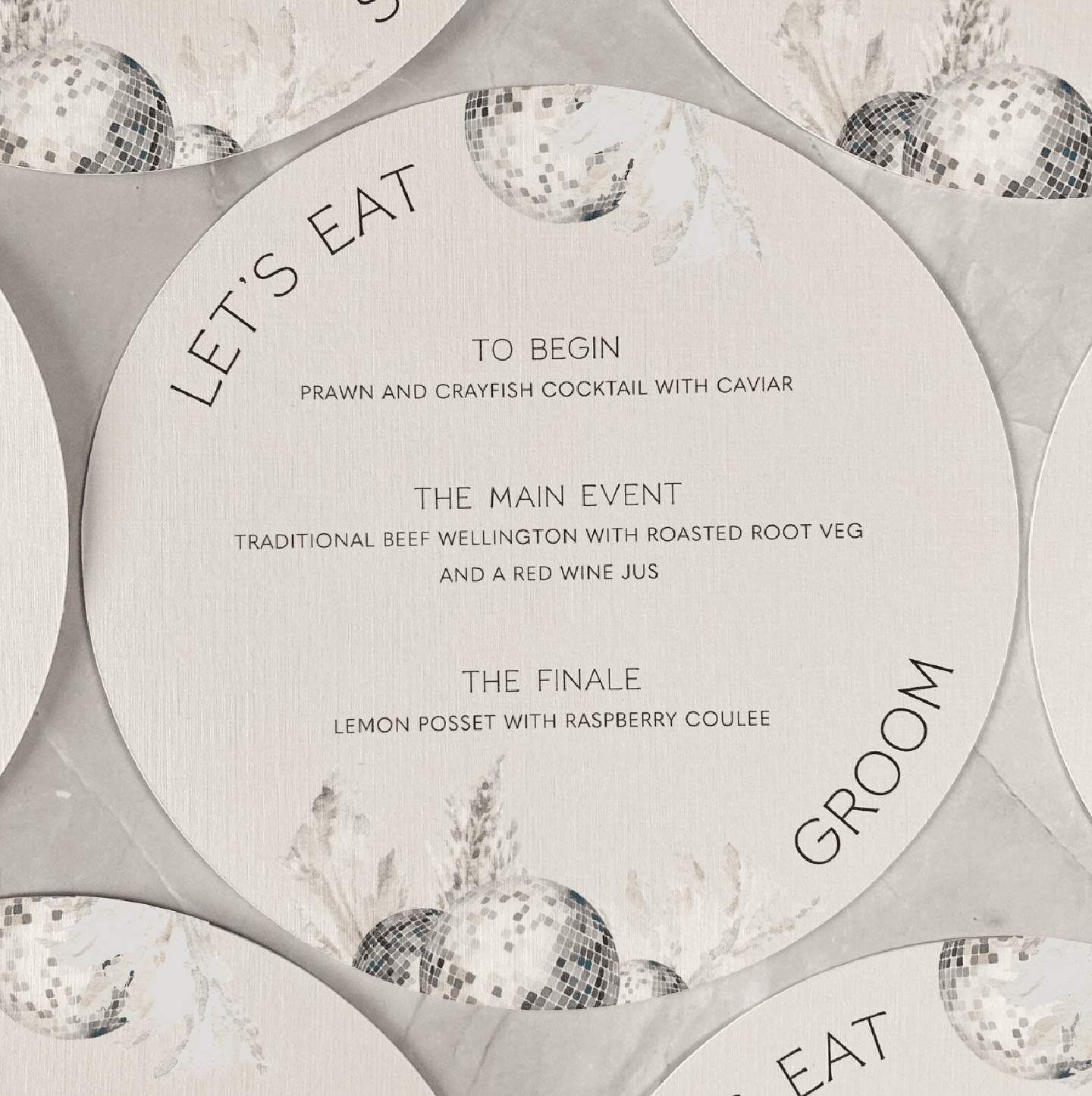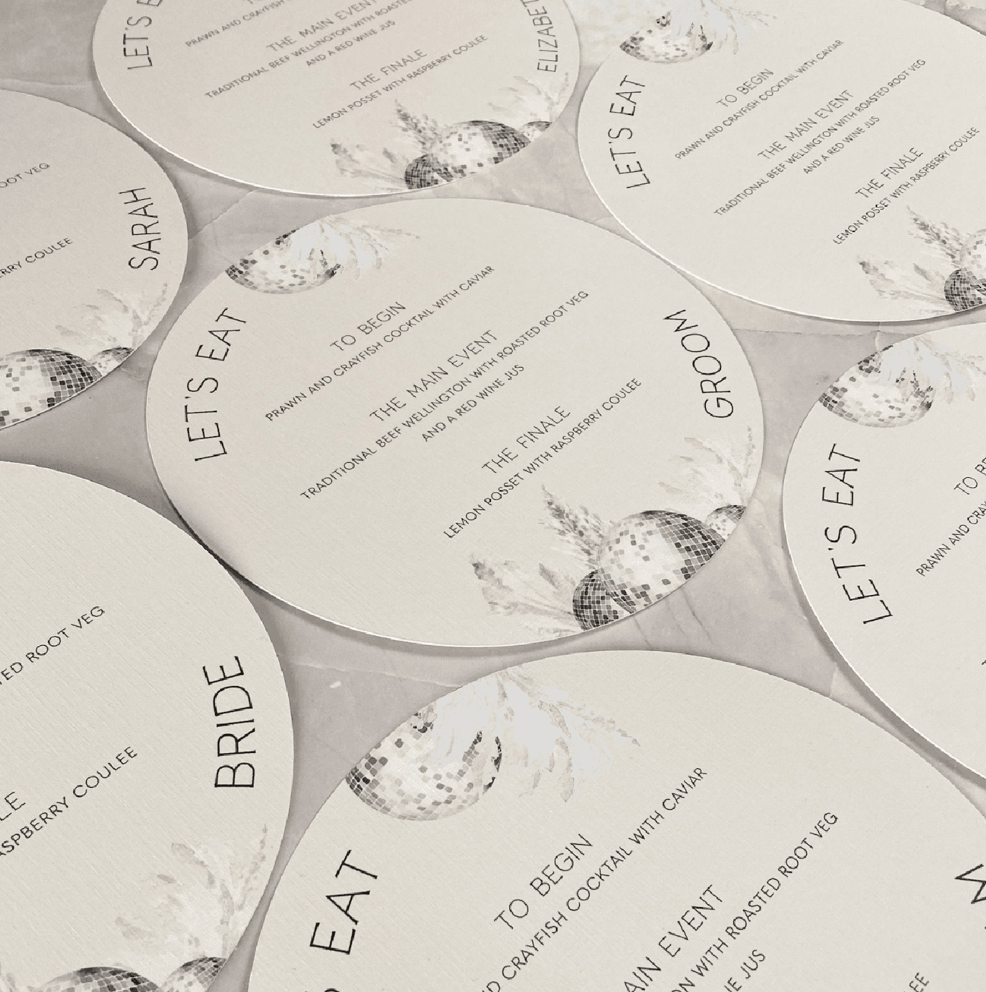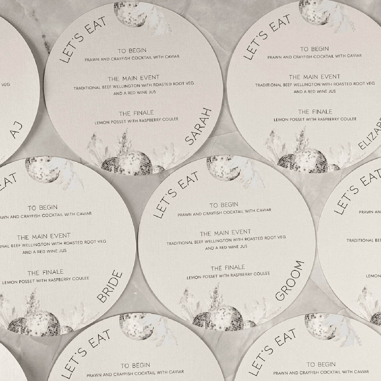 Inspired by the theme pampas and disco, these menus can be personalised with your wedding/event menu and for an extra personal touch, why not add each guest name, meaning no need to buy extra individual place names. Although, our matching disco ball place names pair perfectly with these menus! Also perfect for a boho wedding, hen do/bridal shower or a neutral themed baby shower.
