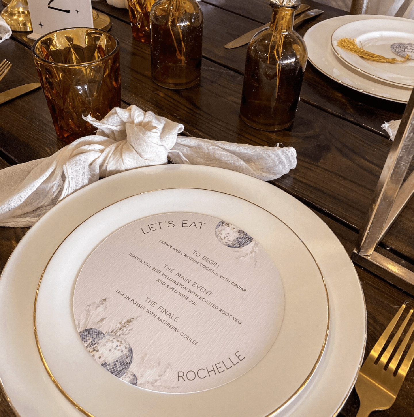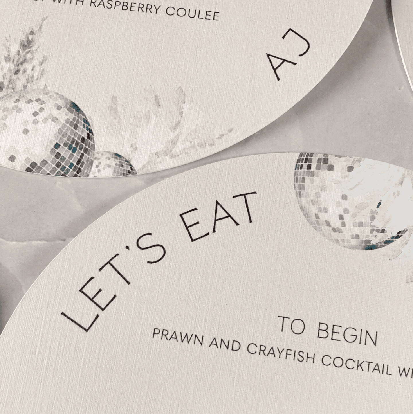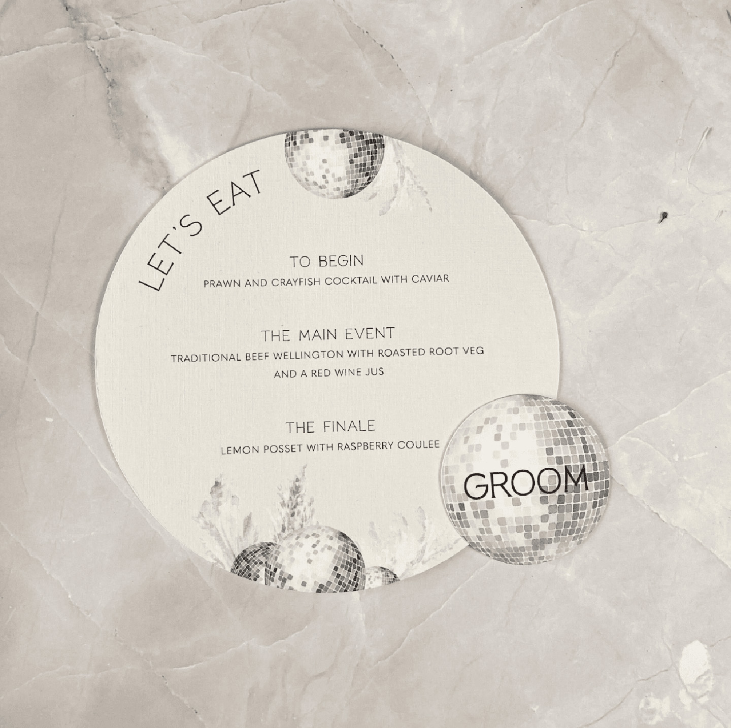 Inspired by the theme pampas and disco, these menus can be personalised with your wedding/event menu and for an extra personal touch, why not add each guest name, meaning no need to buy extra individual place names. Although, our matching disco ball place names pair perfectly with these menus! Also perfect for a boho wedding, hen do/bridal shower or a neutral themed baby shower.