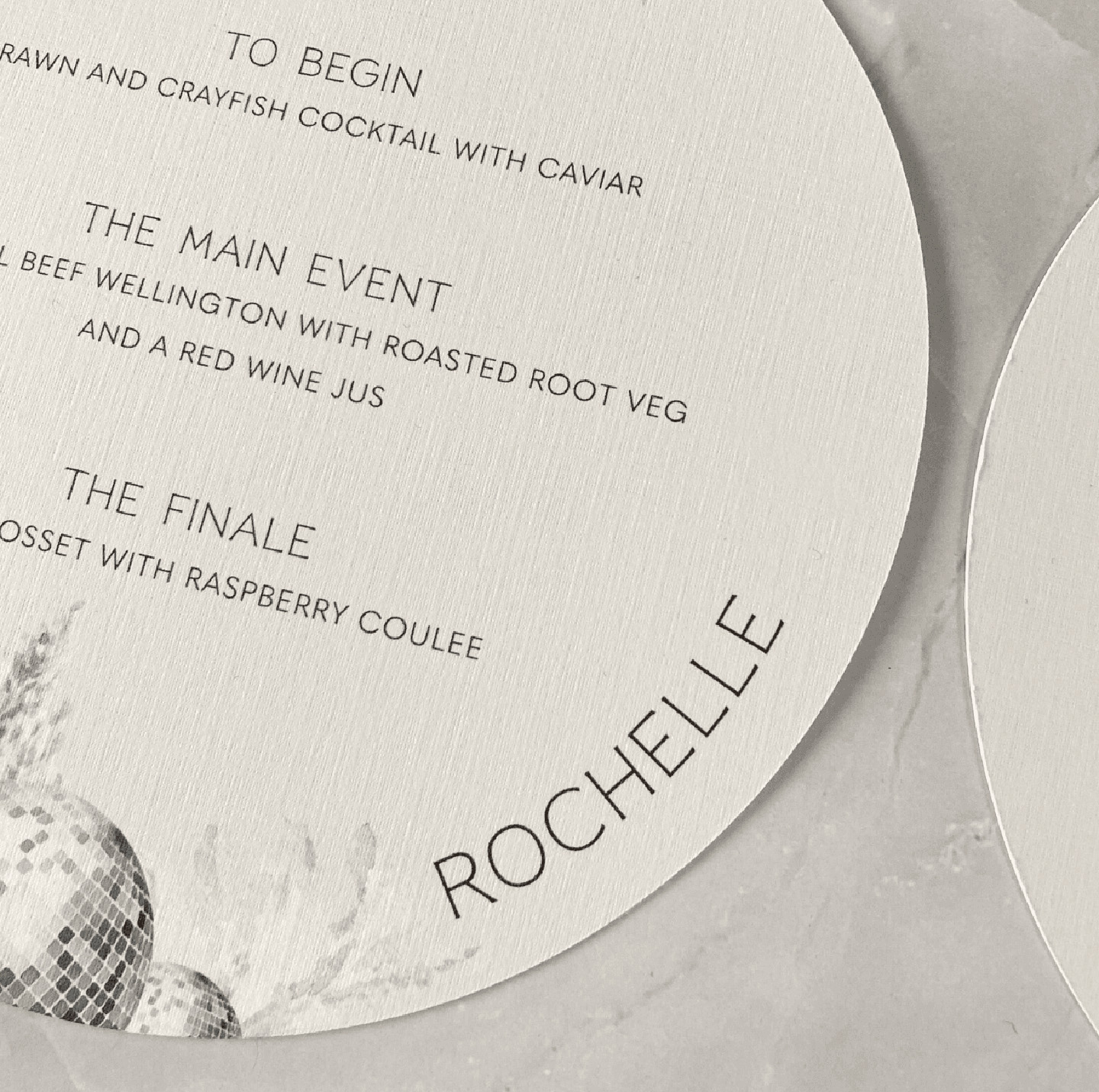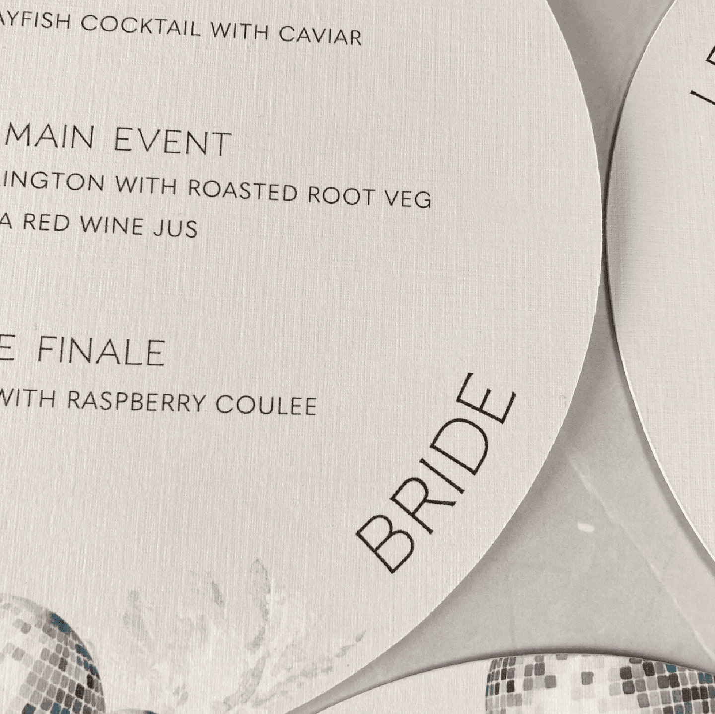 Printed onto beautiful textured card stock which gives the look of linen, each menu is cut into a circular shape (15cm x 15cm) which makes them fit perfectly on the plates on your wedding table.