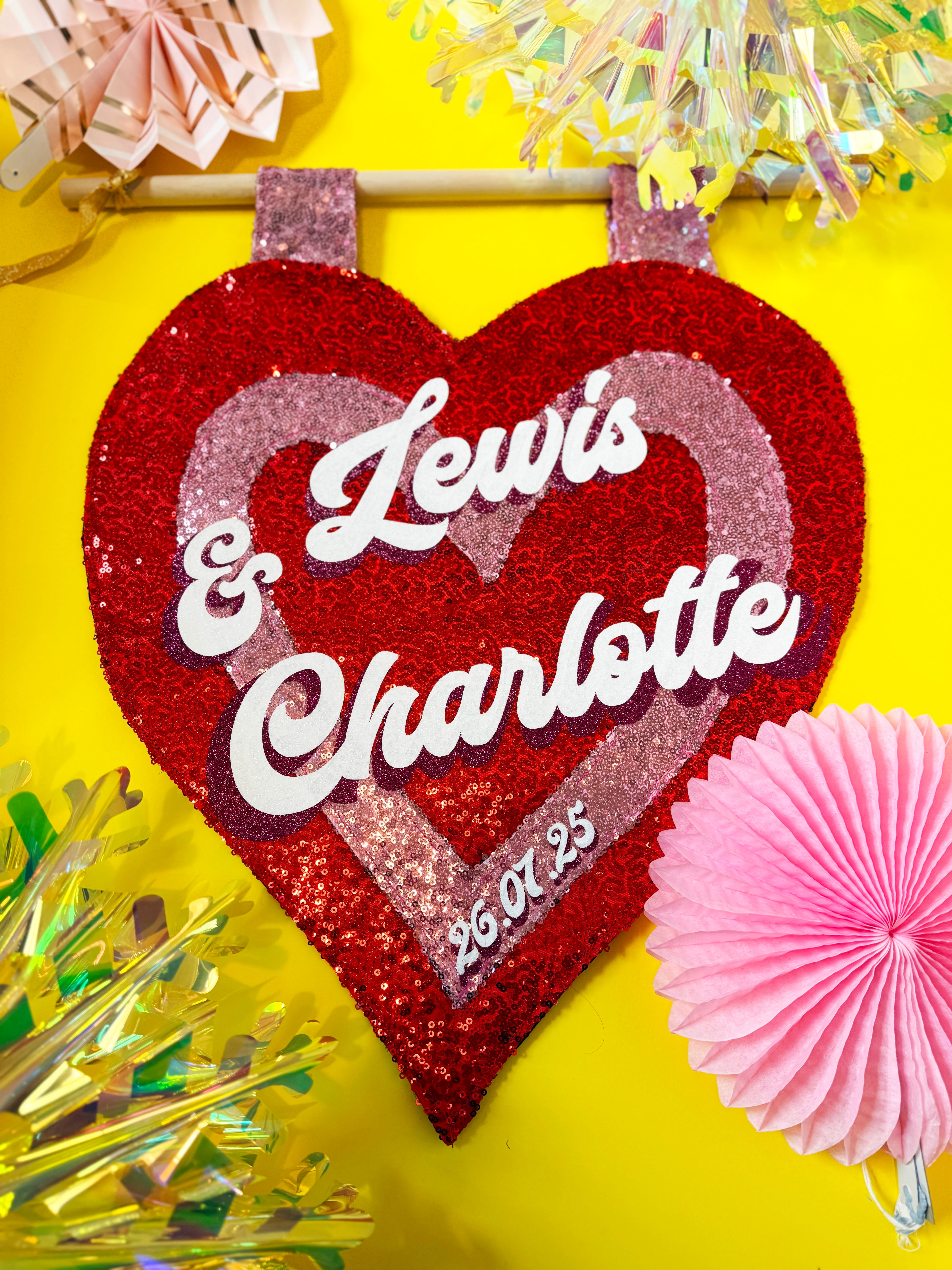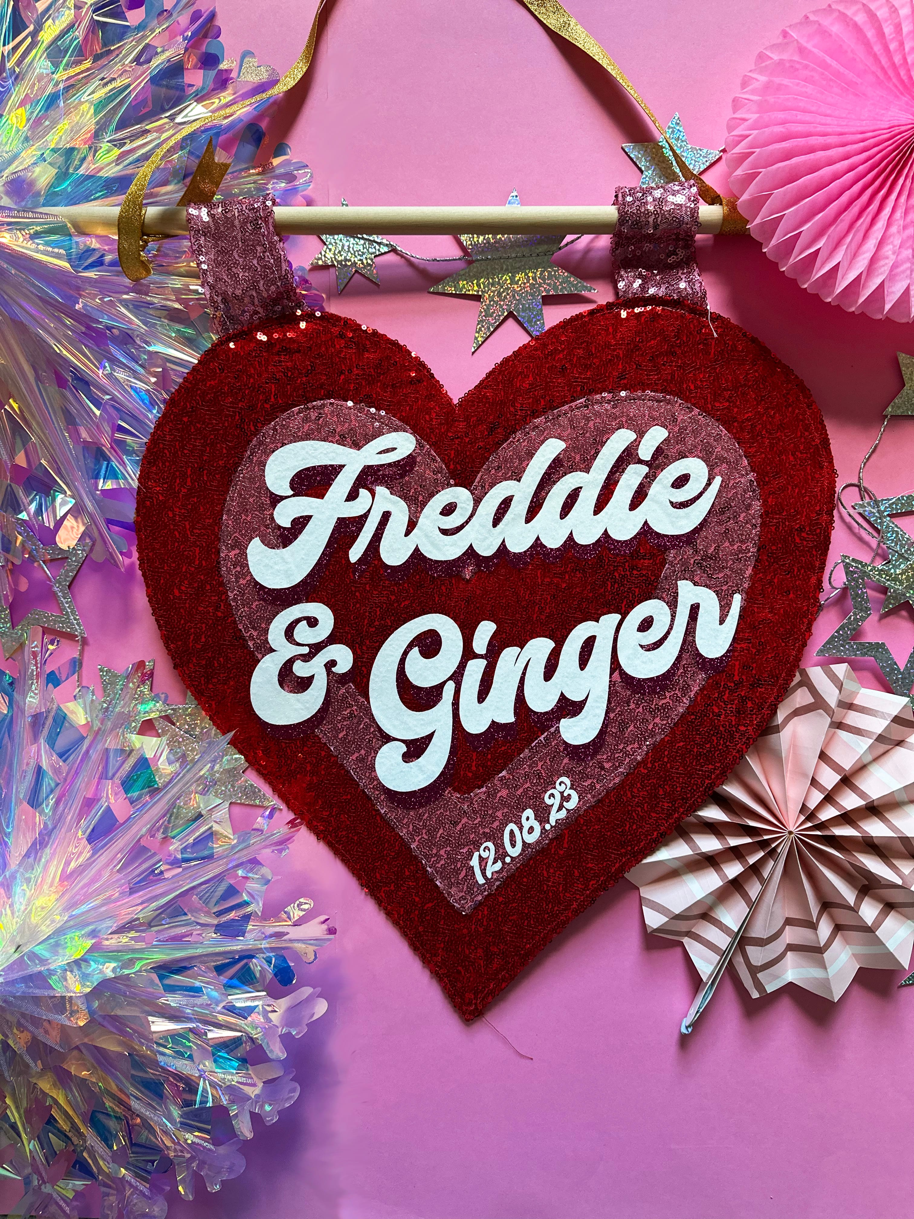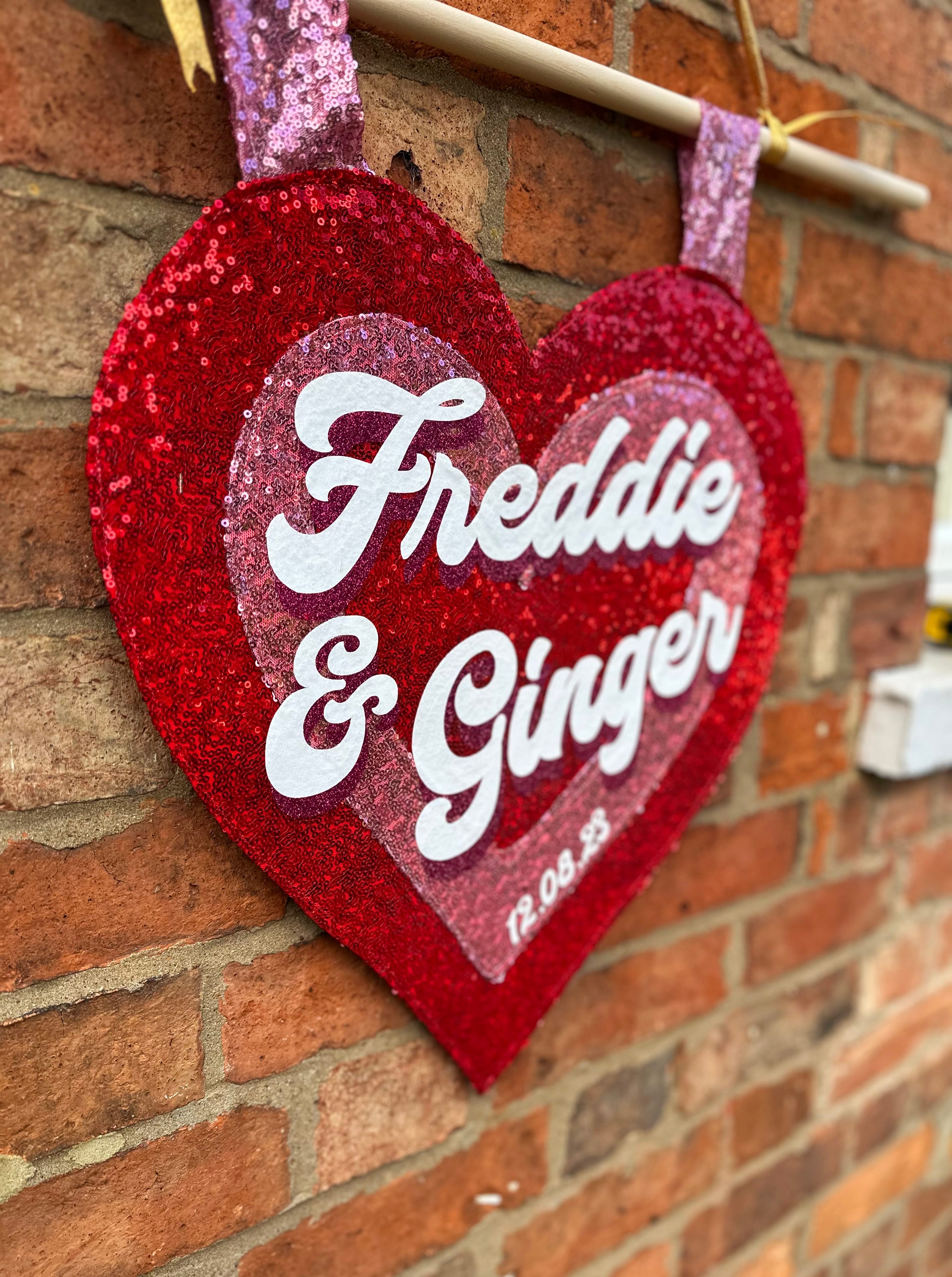 Heart shaped sequin wall hanging. Lettering printed in eco friendly glitter vinyls.