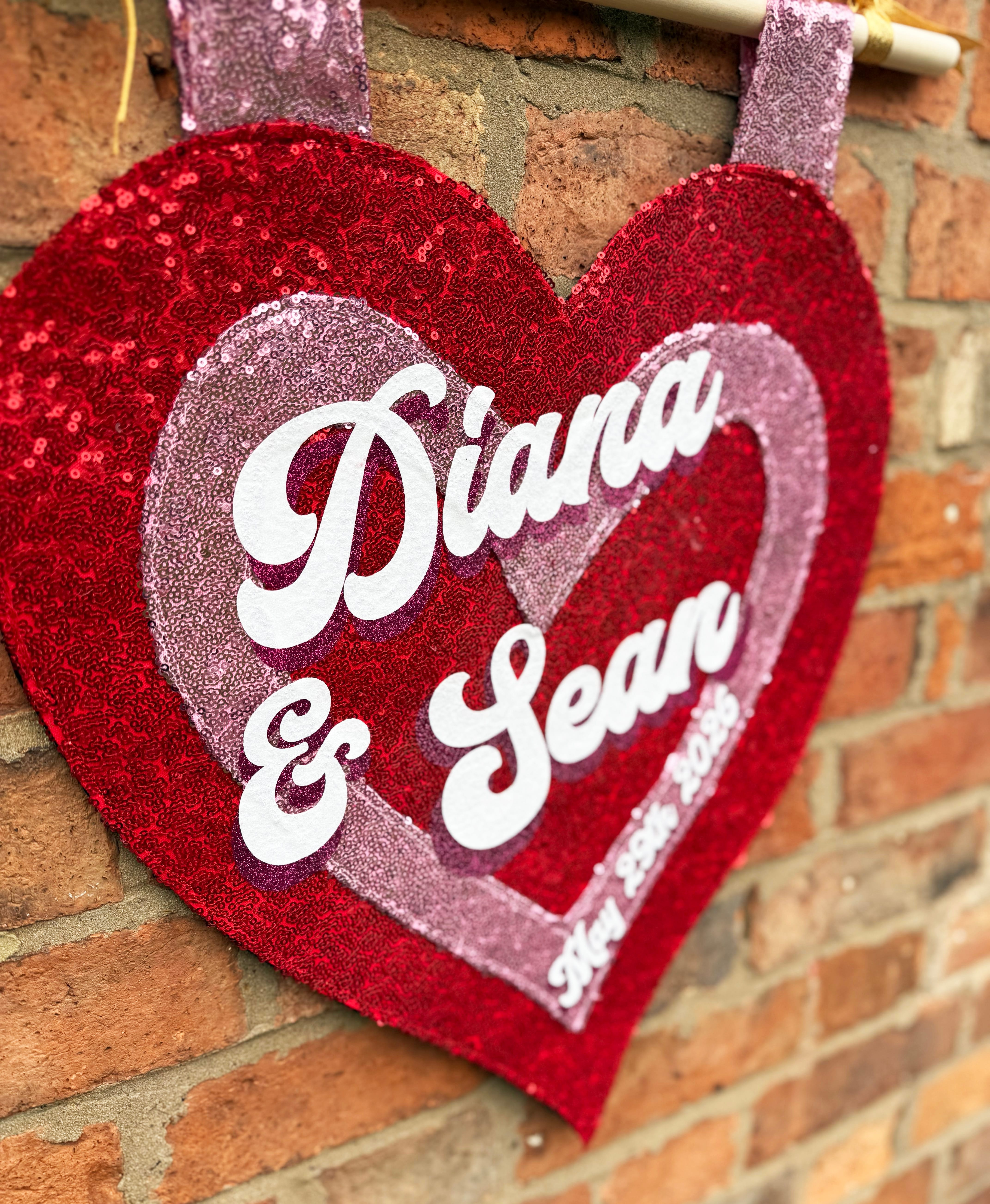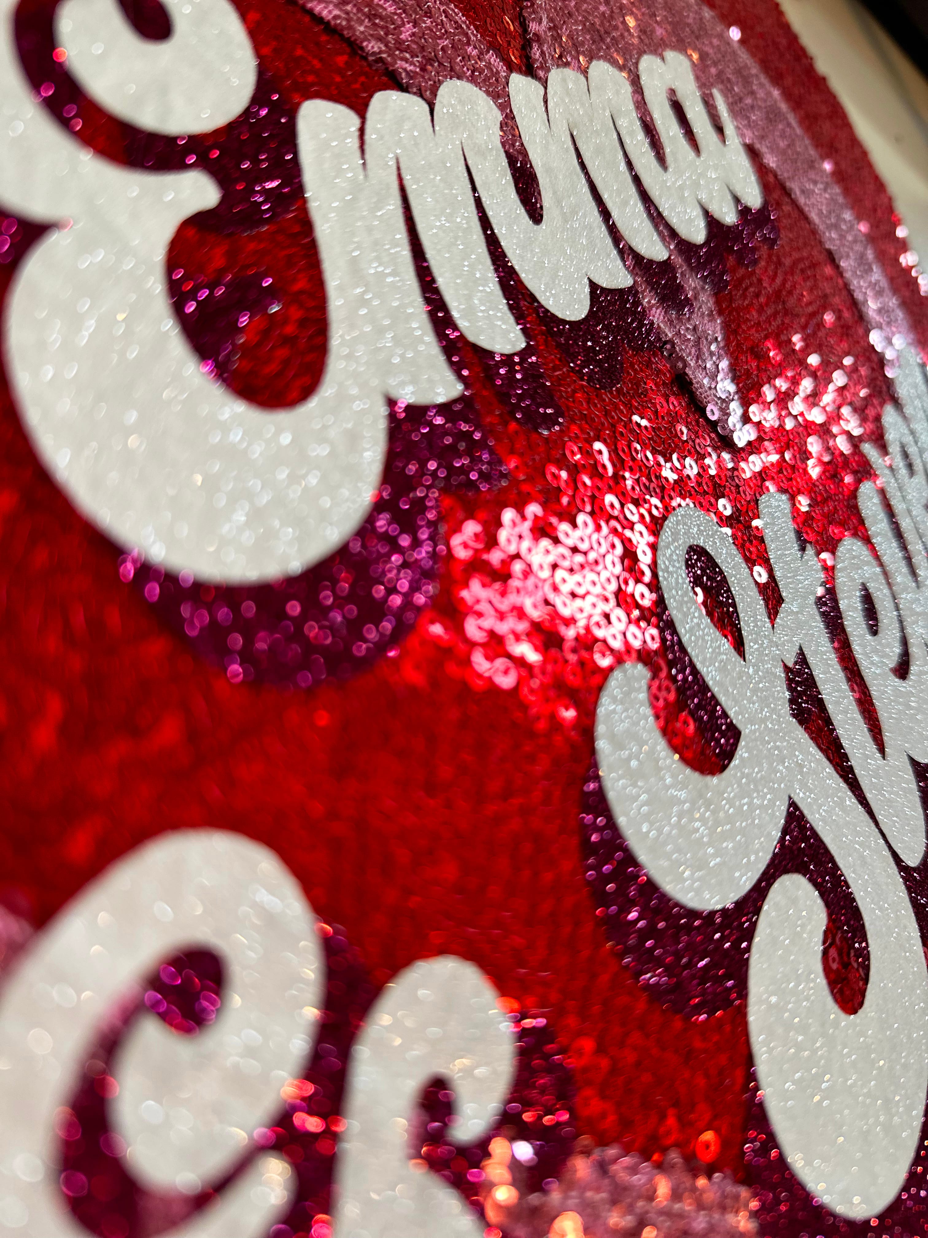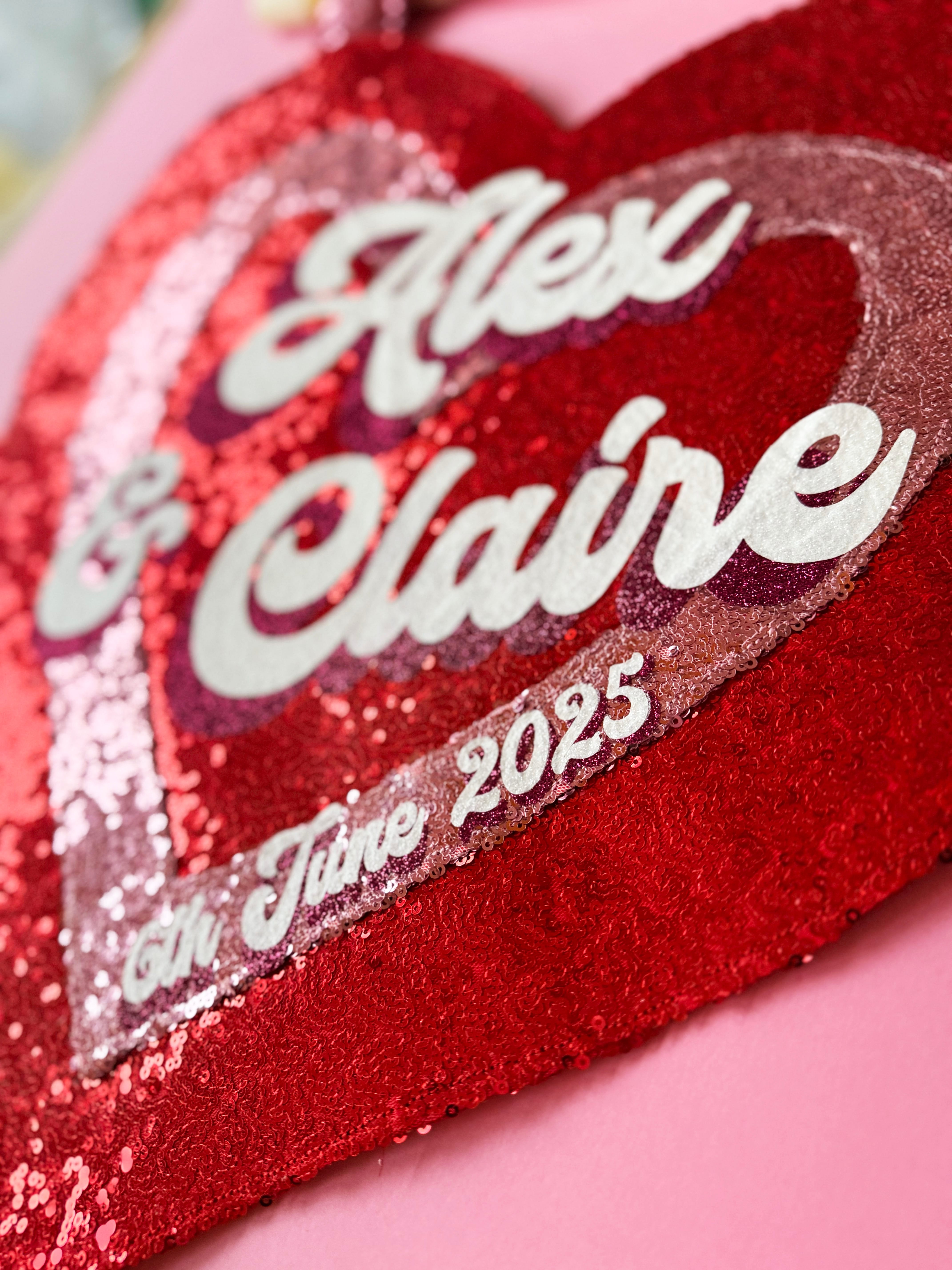 Heart shaped sequin wall hanging. Lettering printed in eco friendly glitter vinyls.
