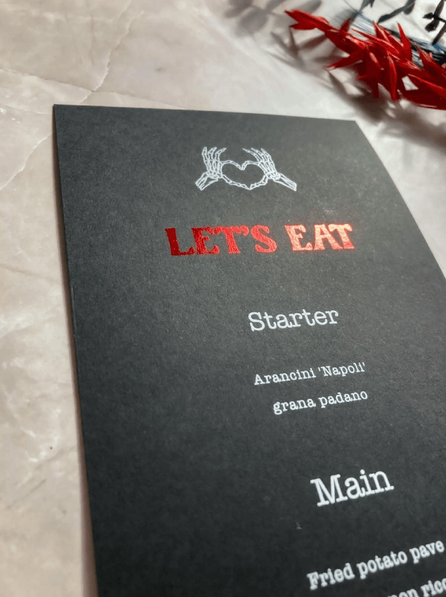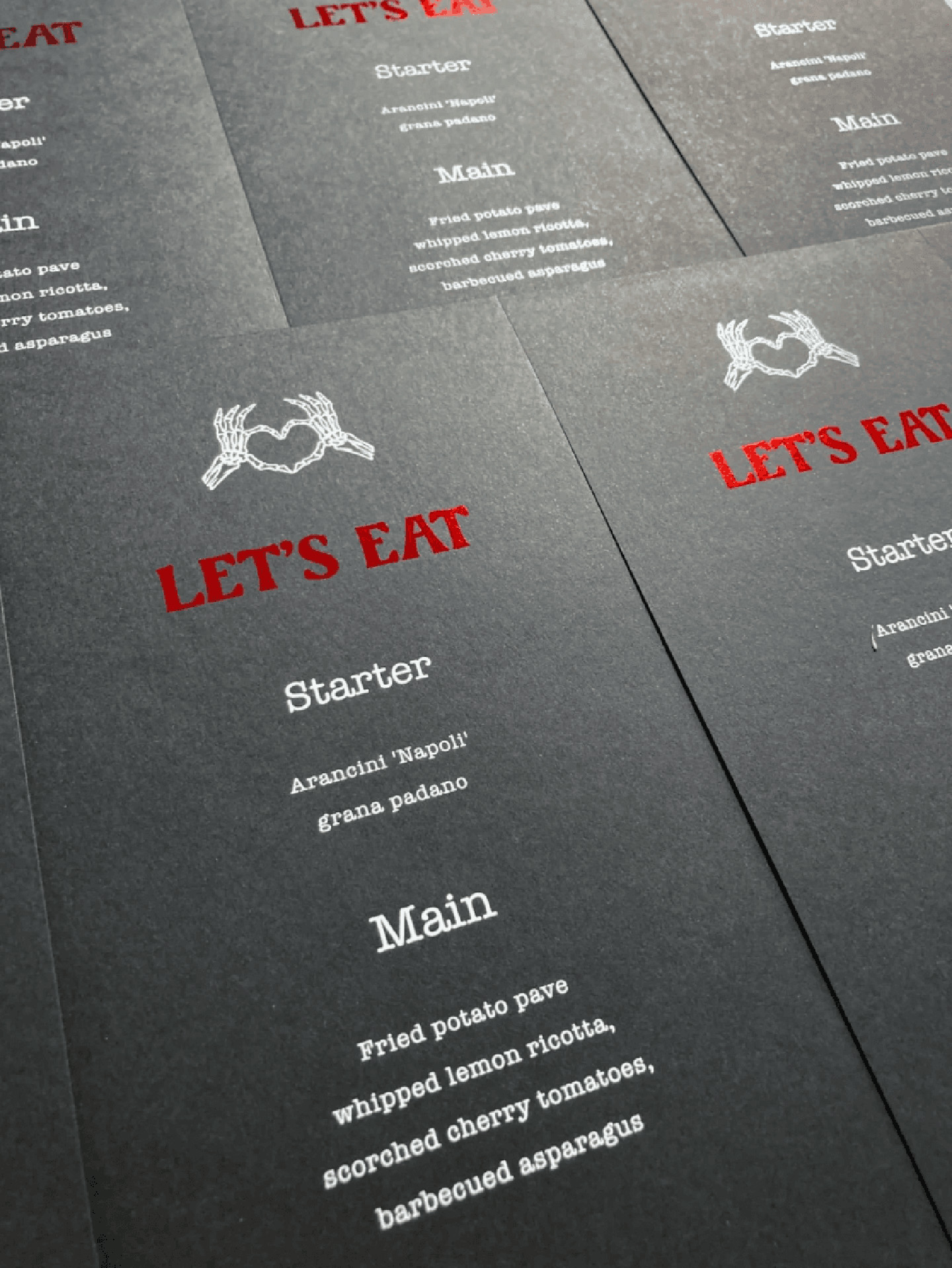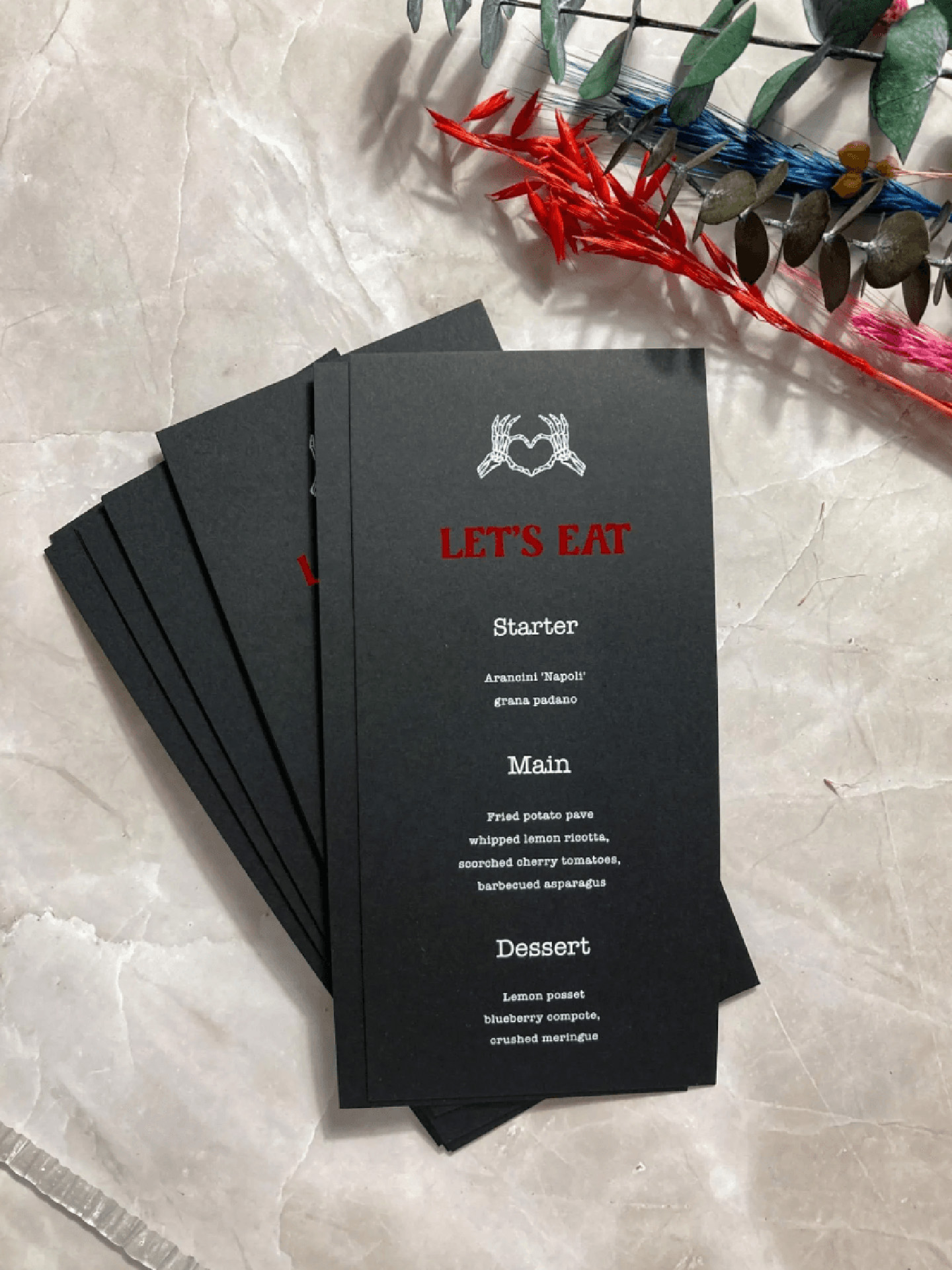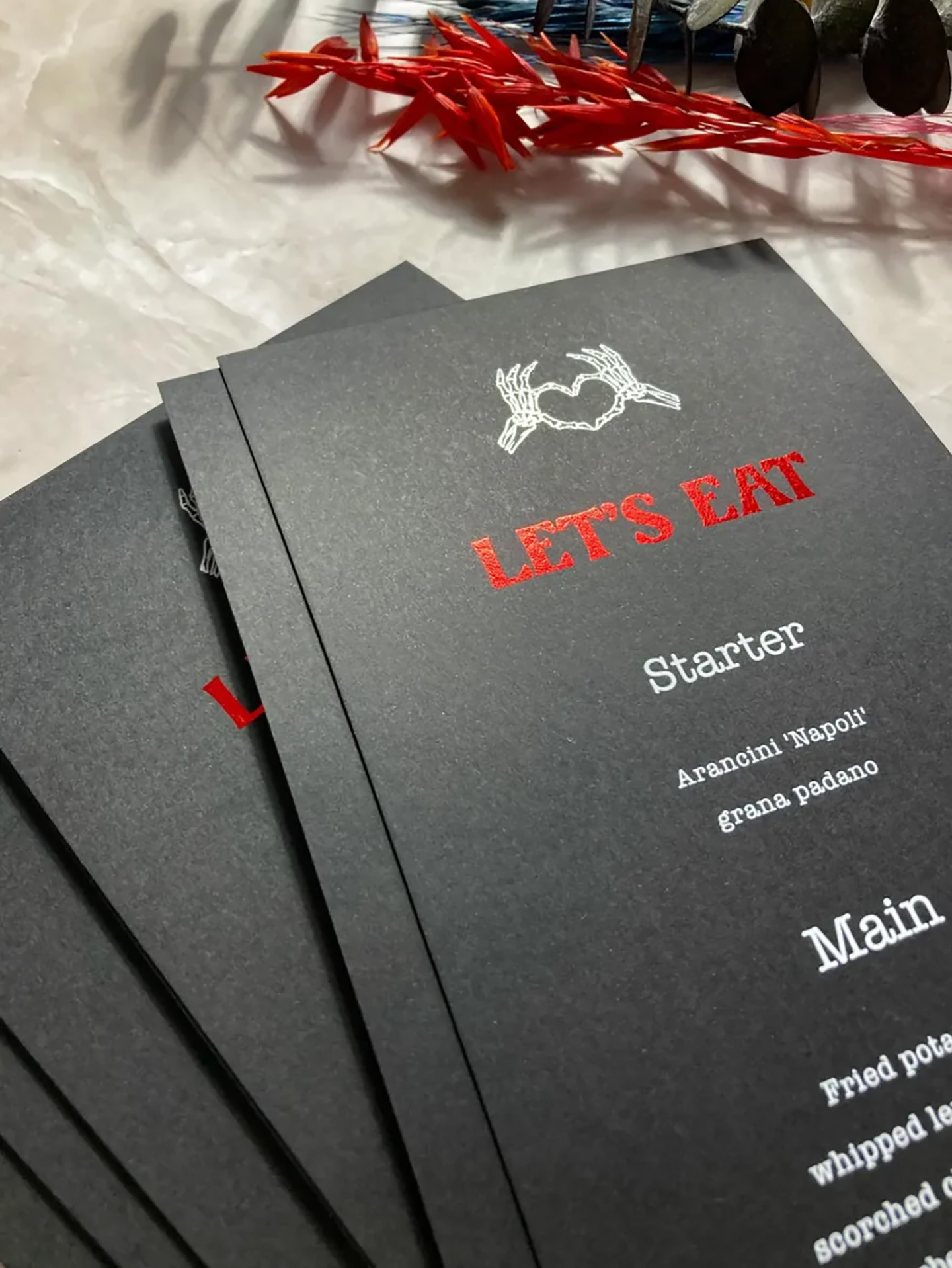 Each menu can be personalised with your own wording and is printed with white ink and digital red foil, onto black card.