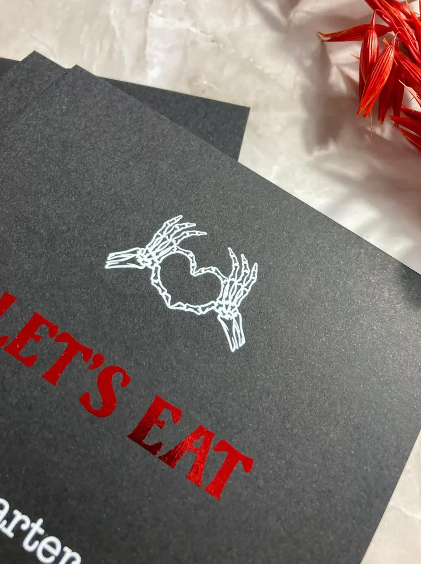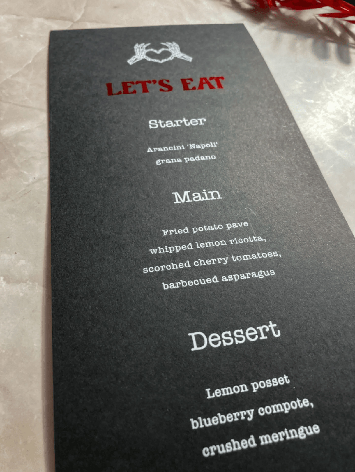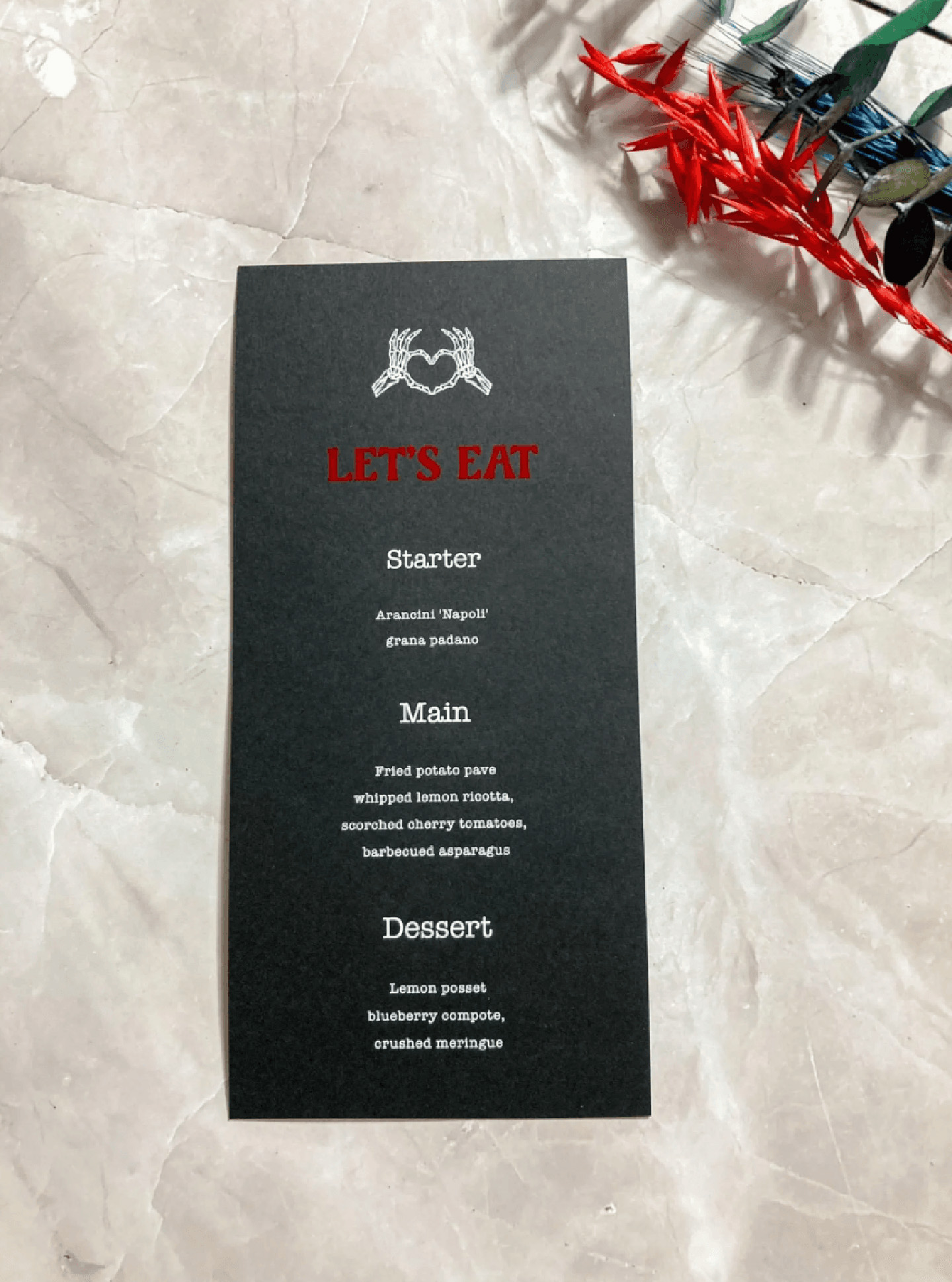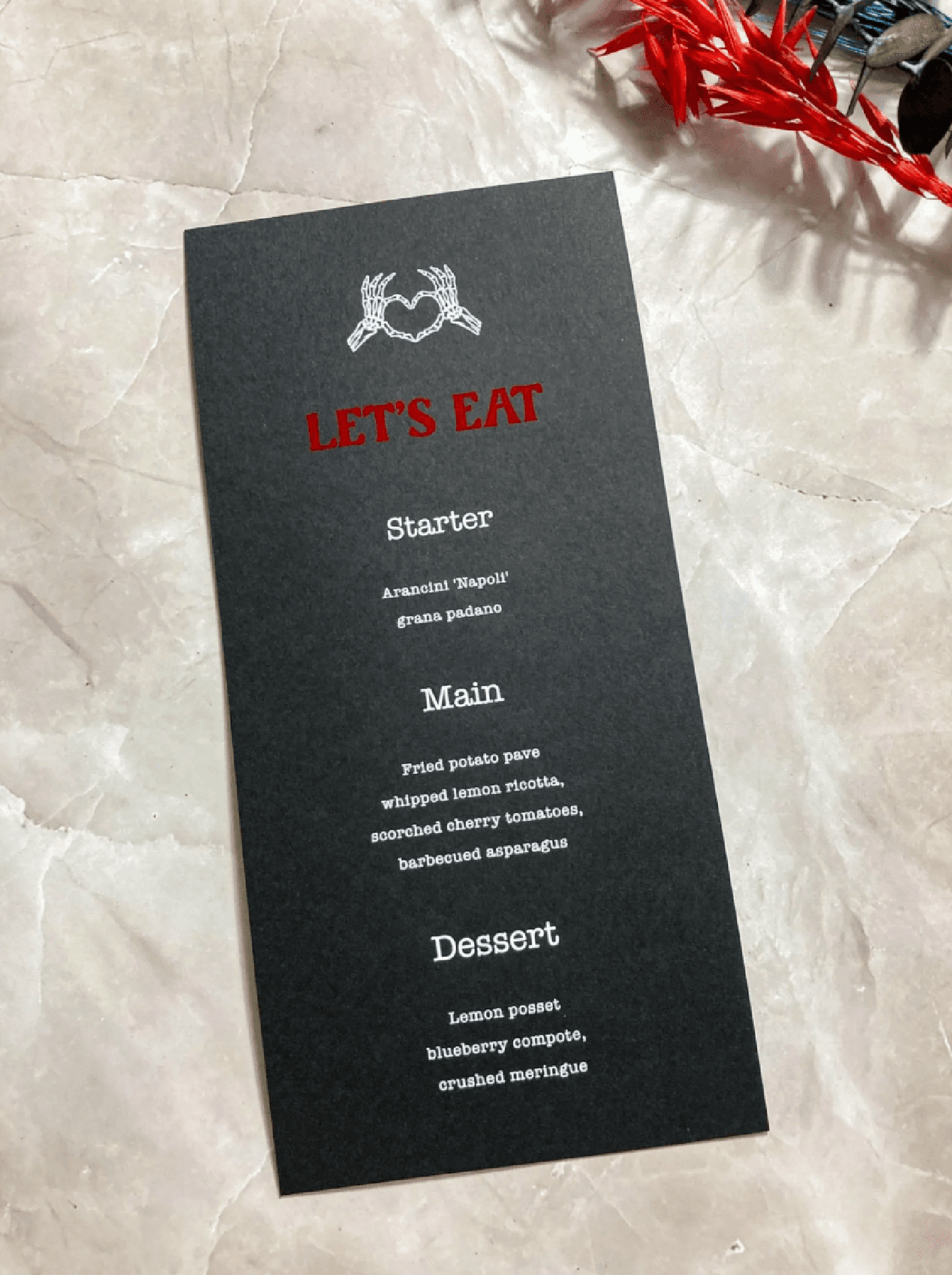 Each menu can be personalised with your own wording and is printed with white ink and digital red foil, onto black card.