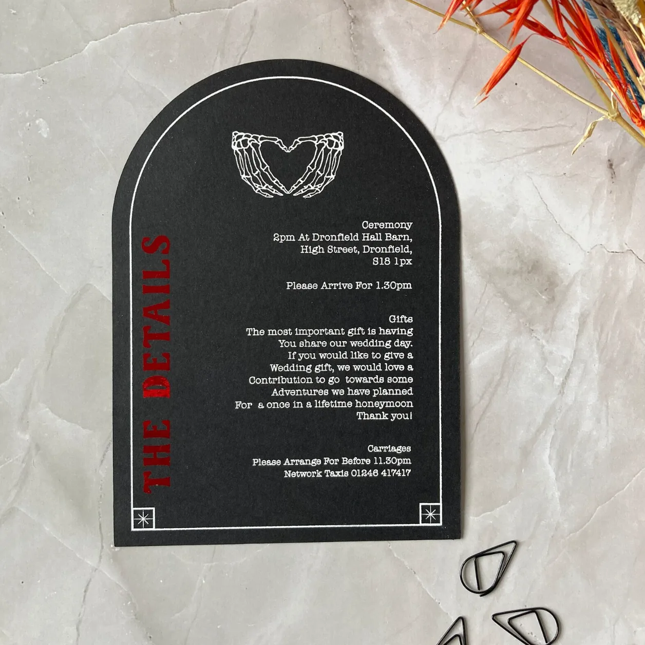 - DETAILS/ON THE DAY PAGE – digital white ink and red foil on 5×7 black arched shape card.