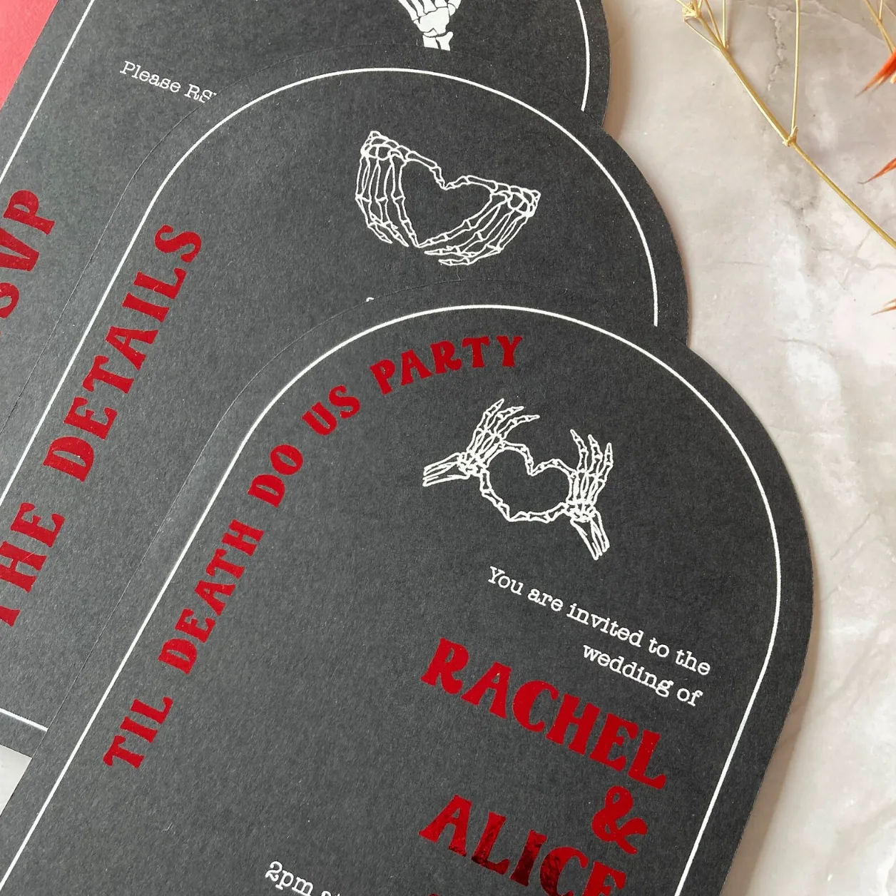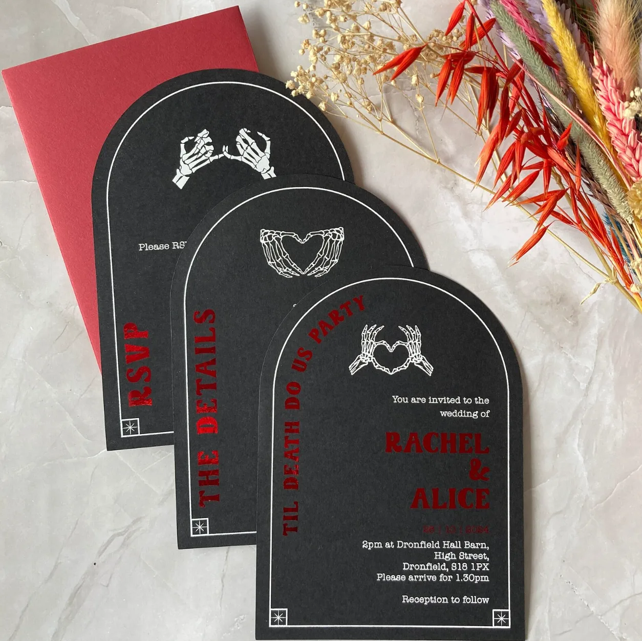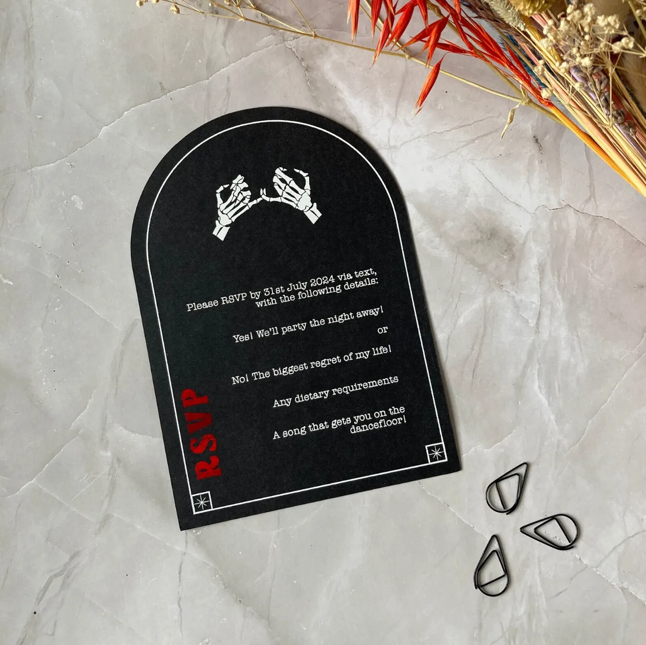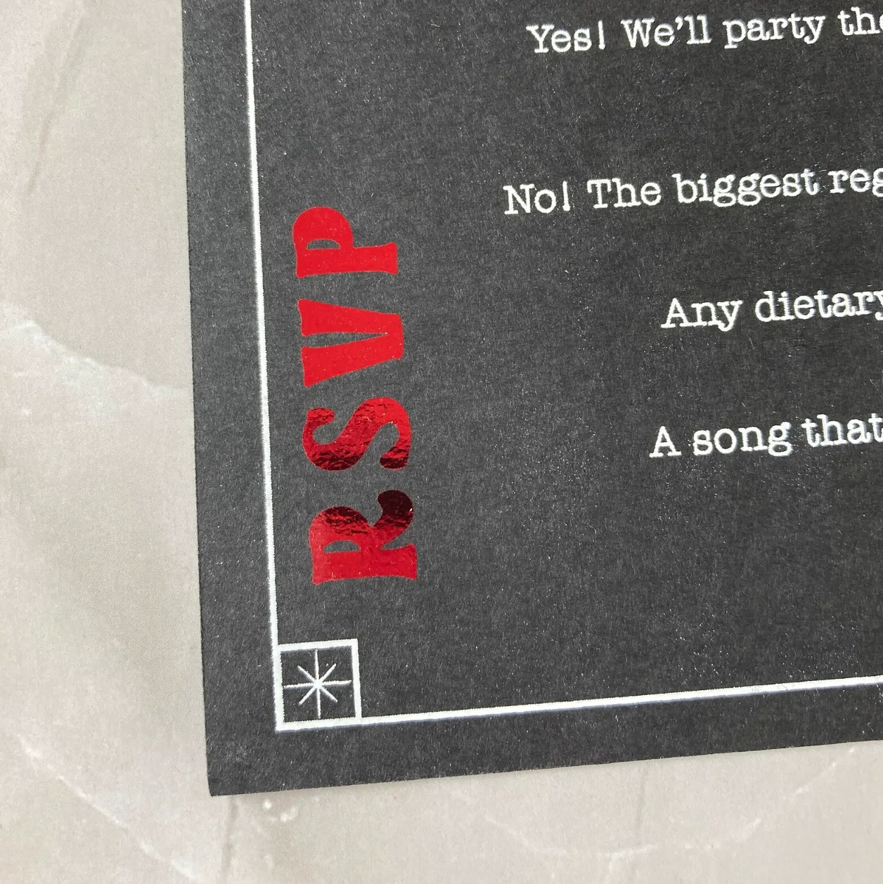 - RSVP – digital white ink and red foil on 5×7 black arched shape card.
