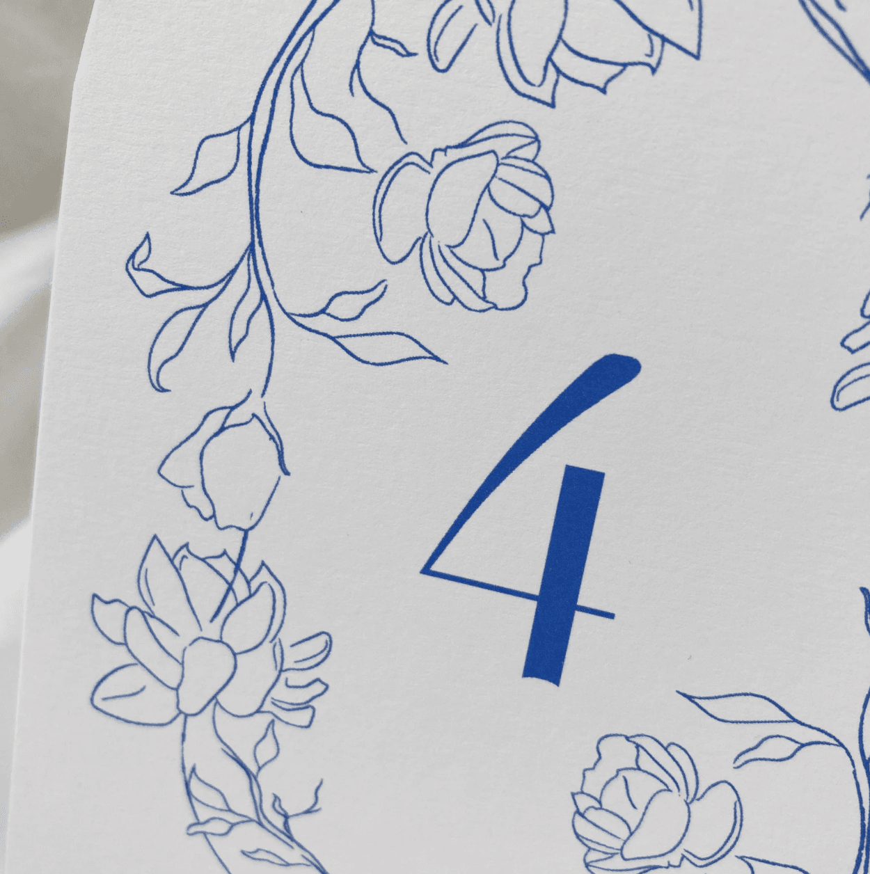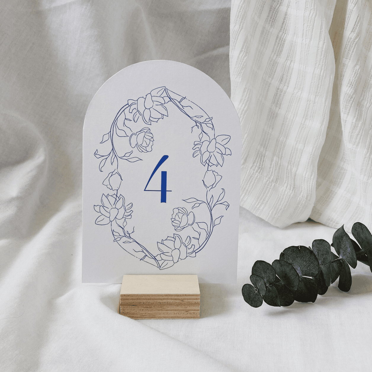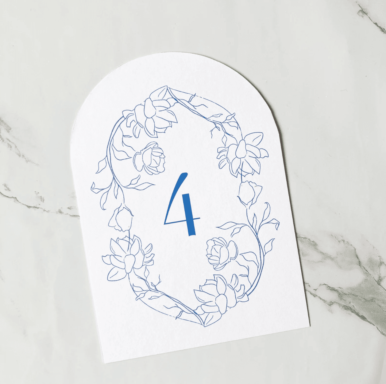 A beautiful blue floral table number, printed onto arched luxury smooth white card, perfect for a destination wedding or a summer bridal shower. Inspired by the blue seas of Sicily.