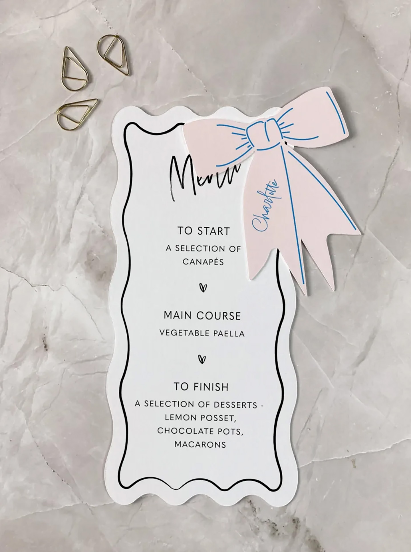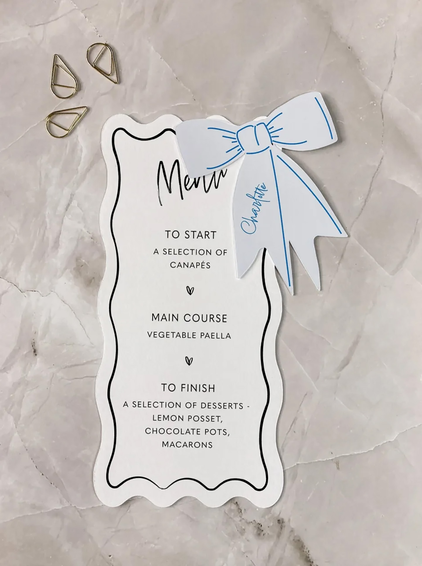 Each menu can be personalised with your own wording and is created using digital black ink printed onto white card. They are available in size DL (99mm x 210mm).