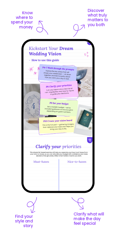 Use this free Wedding Vision Guide to discover what truly matters, define your style, and start planning with confidence — so you can make your day extra special.